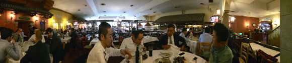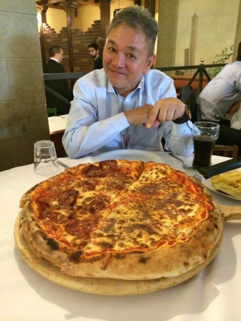 TITLE:イタリアはピザもデカい 2014年10月15日 ホテルの近くの巨大なピッツェリアでランチです。 パノラマ撮影してみました。 巨大です。 出てきたピザがみれまた巨大。 一切れ食べれば十分という感じです。 私はピザで満腹でしたが、若い社員はさらにパスタを食べてました。 ボローニャ名物「ボロネーゼ」です。 しかしよお食うなっって、、その食べっぷりに暫し呆然