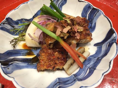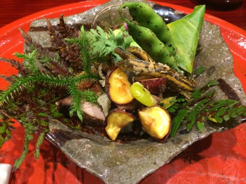 最初はいかにも「なかひがし」らしい一品、、、揚げ栗や摘み草のような草やお豆、、自然をそのままお皿の上に再現したような美しい皿です。