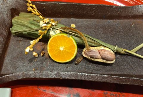 子持ち鮎の笹包み、みかんをかけて戴きます。