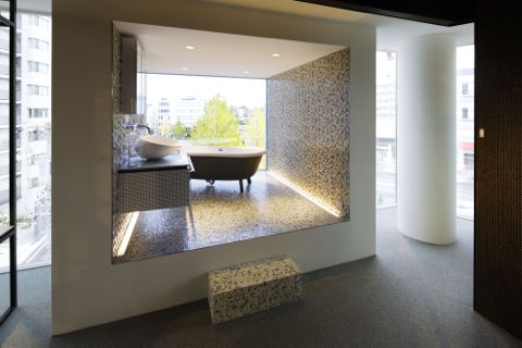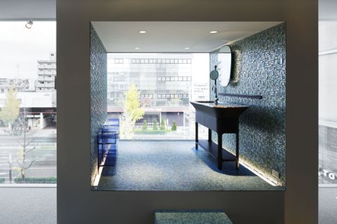 突き出した窓にはハイメ・アジョンの新作洗面、壁は凹凸が美しいガラス・モザイクのストラクチャアー