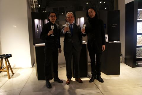 パーティーが終わって、今回の包丁をディレクションしてくれた丸若屋君とデザインを担当してくれた猿山君と包丁の前で完成を祝ってシャンパンで乾杯です。