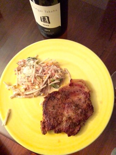 杉本さんの話だと「和」に合うという事だったので、宮崎産の黒豚に塩胡椒と醤油を少したらして軽くソテーしたものと自家製のごぼうサラダ、やや和よりの洋食に合わせてみました。