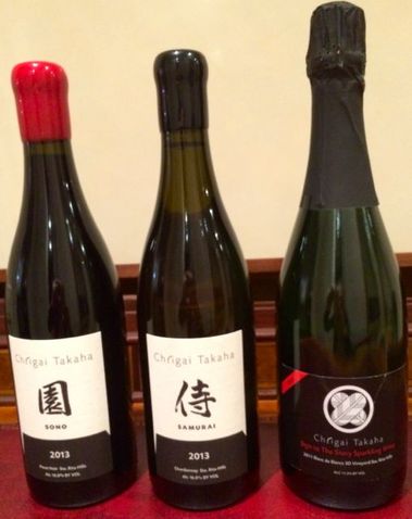 向かって右から家紋シリーズのシャンパン、漢字シリーズの白ワイン「侍」、シャルドネです。そして左端がやはり漢字シリーズの「園」、美のノワールです。