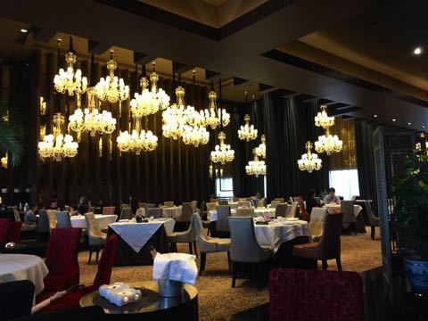 シンガポール最終日は夜中の飛行機だったので、それまで時間があったので陳建一の息子で陳建太郎がやってるマンダリン・ホテルの最上階の「四川飯店」に行ってみました。最上階だけあって、眺めは抜群、おまけにインテリアは超豪華。無数に吊るされているシャンデリアは全てパカラ。