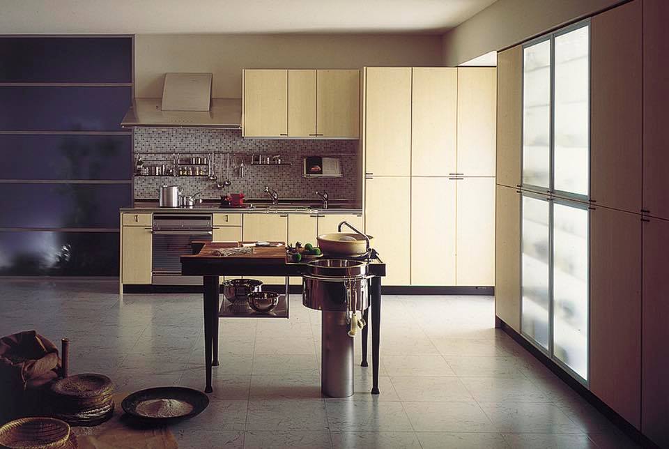 印象的なのはキッチンの前にあるコンパクトなアイランド キッチン「スパイコ」です。システム キッチンの限界を感じ始めていた頃で、キッチンのシステムに依存しないキッチン パーツを加えることで、キッチンのシステムにより多様性を持たせることが出来、デザイン的にも機能的にも大きなブレークスルーを可能にする事を期待して開発したのですが、時代が早すぎたのか、それともニーズそのものが無かったのか、殆ど売れませんでした。
