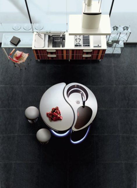 キッチンはプロトタイプで、「時計仕掛けのオレンジ」の描くインテリアに触発されたもの。