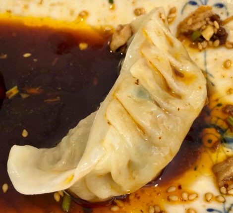 ピリ辛の少し甘いタレに浸された水餃子。焼き餃子は「よだれ鳥」を注文して、鳥を食べた後の残ったタレに付けて頂きます。