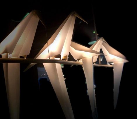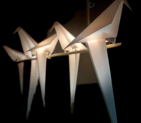 5匹の鳥が木の枝に止まって、光を放ちながらユラユラ揺れてます。