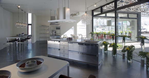 バティオを通ってショールームに入ると、正面にはマッキントッシュの「Lattice Back Chair」がお客様をお迎えします。椅子の後ろは窓になっていて、少し逆光気味に見せることで椅子のフォルムおの美しさをお客様に感じて頂くというのが意図です。また、この椅子を象徴的に感じて戴くことで、TOYO KITCHEN STYLEがどんなキッチンをお客様に提供しようとしているのかというのを少しでも理解して貰いたいとという思いもあります。