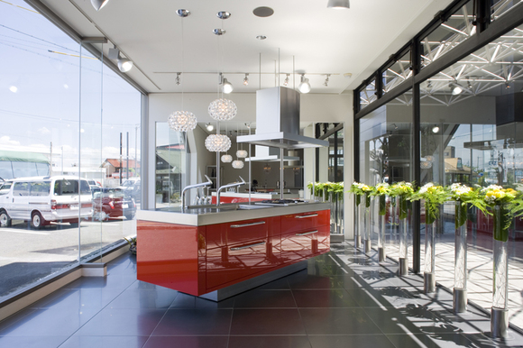 ショールーム正面に斜めに切り描いた大きな窓がとても印象的です。この窓から覗く「Rosso Japonese」と「カボッシュ」の美しさは、また格別です。日も暮れると、その印象はさらに強烈です。
