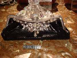 左のバッグは大小のスワロフスキーと精緻な金具細工が組み合わせれたゴージャスなバッグ。とても華やかで、最近のファションのトレンドを反映した、いま一番旬なデザインかもしれない。