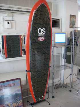 会場で見かけた、秋冬のモチーフの「ビンテージ・アロハ」をそのままサーフボードに貼り付けたい板。熊谷氏専用とのことでした。