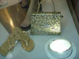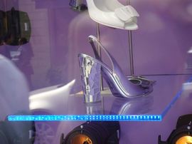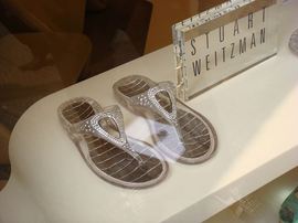 日本でもかなり一般的になってきたクローム素材の靴とサンダル、、サンダルにはスワロフスキーが埋め込んである。