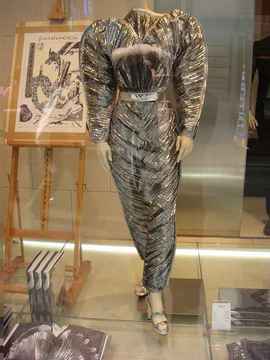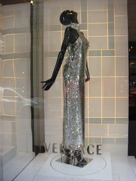 左はクリッツィアのロング・ドレス、右はベルサーチのロングドレス。どちらもメタリックなクローム調の質感を持つ美しいドレス。価格は知らぬが華なんでしょうね・・