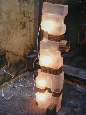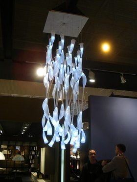 写真(右)は、珍しいチューブのシャンデリア。半透明の白いファイバーを編んだチューブの中に光源が入っている。一瞬何かと思った。でも美しい。
