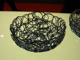 写真(右)はアレッシーの新作の籠、、デザインは言わずと知れたカンパーナ兄弟。アレッシーもステファノ・ジョバンノーニ的なポップな製品からの方針転換か?エドラのワイヤー・の椅子と同じように、とても工業製品とは思われないけど、アレッシーだから量産製品なんでしょうね。でも、一体、どうやって量産するのだろう?? 不思議!!