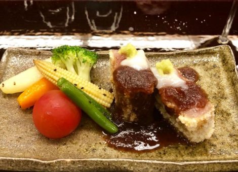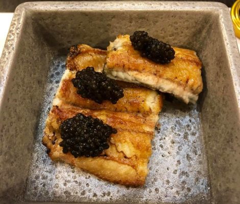 名古屋の熱田蓬莱軒の特別メニュー「鰻の白焼きキャビア乗せ」。