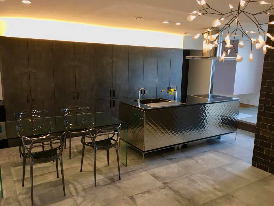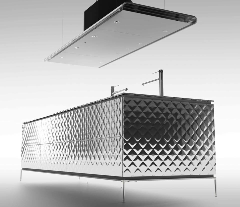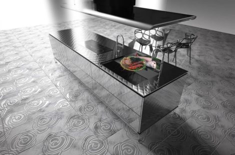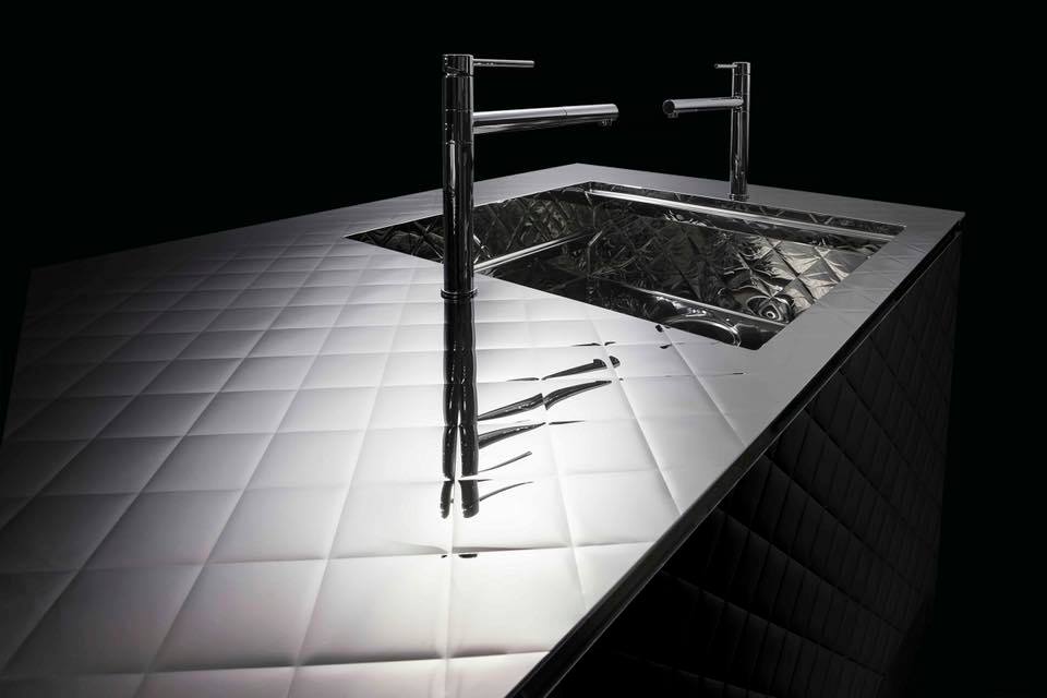 It is a kitchen “quilt” covered with mirror-finished stainless steel whose whole body was quilted. The sink is also quilted stainless steel with the same specular surface.