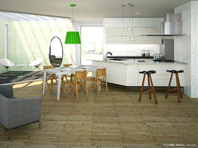 キッチンまわりの壁に装飾した白いベネツィアンモザイク。窓ガラスを抜けて、テラスの壁も装飾しています。テラスの壁を、内装と同色を使用したことで、テラスがLDKの延長として空間により広がりを持たせてくれました。また光の当たり方ひとつで、様々な表情を見せてくれます。見る者を飽きさせないインテリアアイテムです。