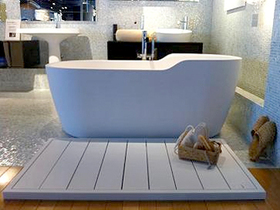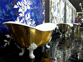 水の中に絨毯を敷き詰めたかのような表情です。またライティングの光がベネツィアンモザイクに反射し、宝石のような美しい輝きが水の中に広がります。また落ち着いた暖色系カラーを基調とした空間ですが、SICISベネツィアンガラスの中で最もラグジュアリーなカラー:ゴールドが、これ以上ない高級感を与えています。