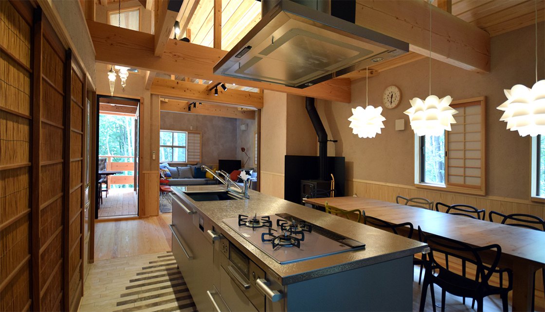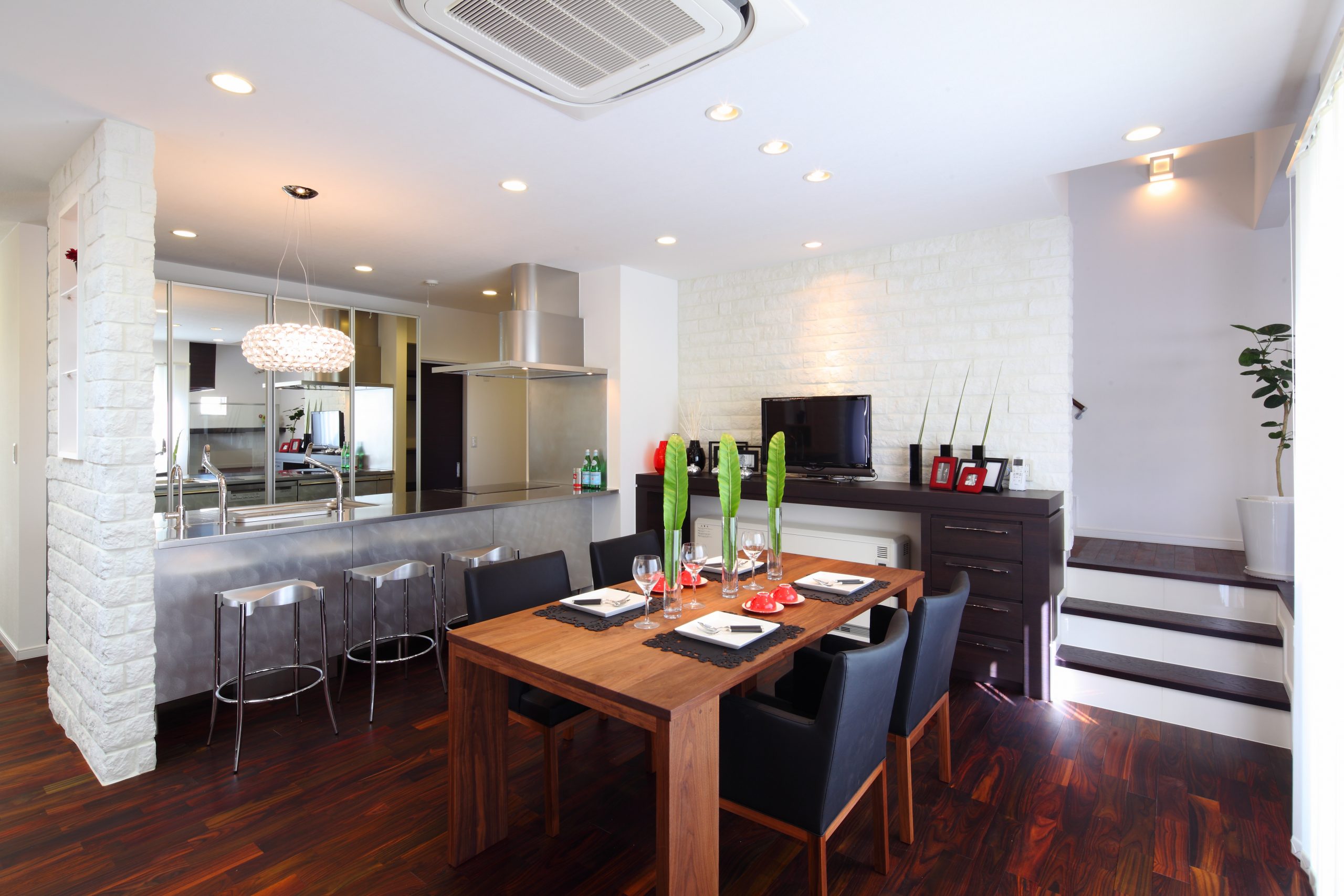 ホテルのラウンジを思わせる空間に設置されたキッチン。常にリビングを向いて作業ができるので、家族との会話も弾みます。