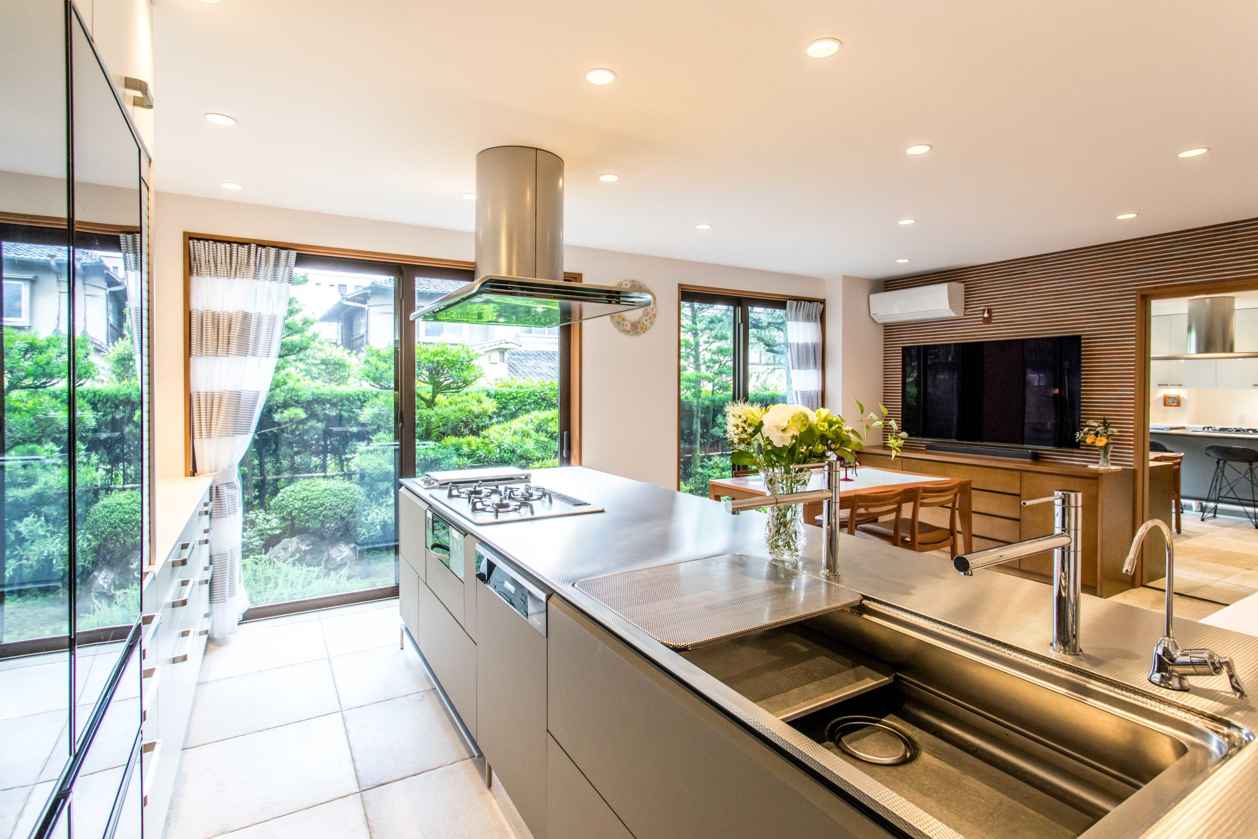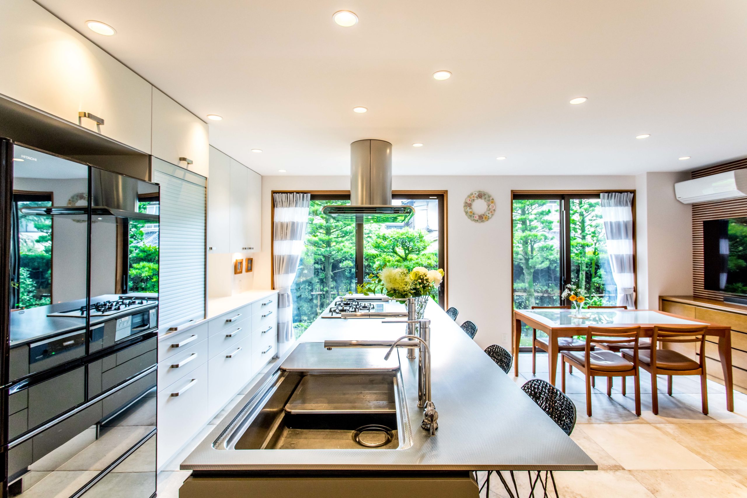 機能的なキッチンを最大限に活かすべく、あえて壁面収納は真っ白に統一をし、その素材のメリハリがノーブルな空間を作りあげています。