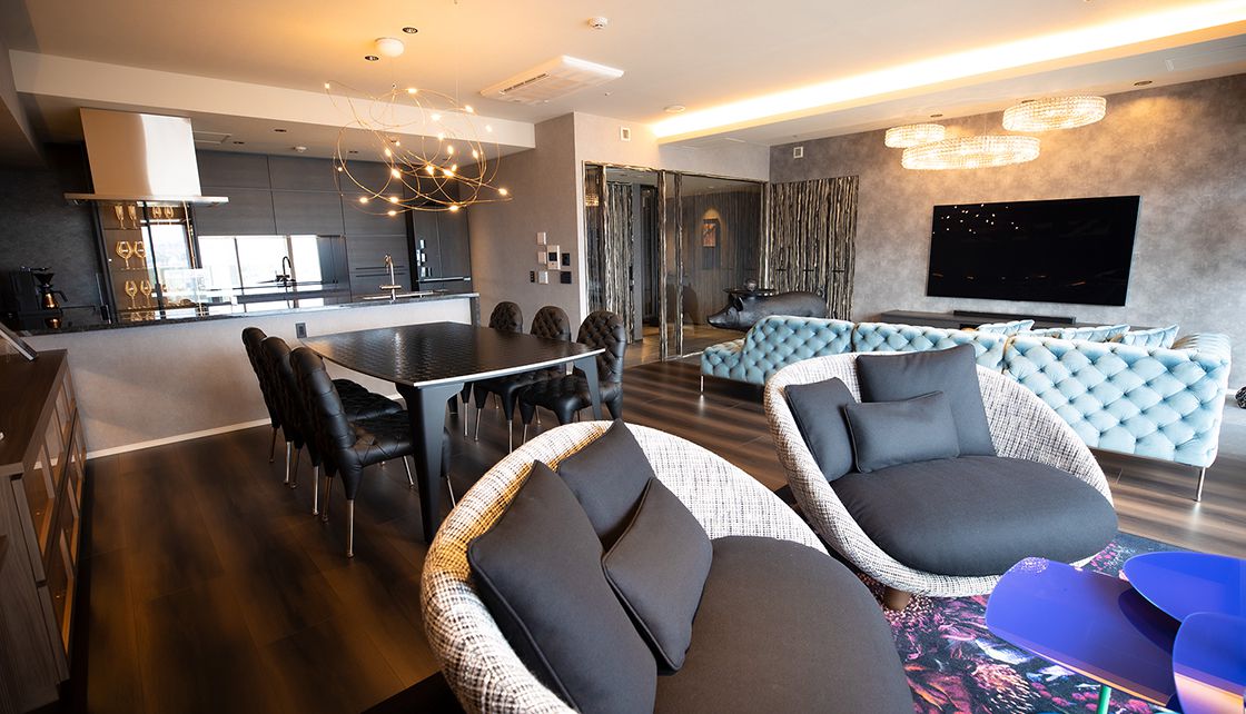 オリジナルテーブル「オリガミ」は集チェアに合わせて、ブラックマーブルの天板をチョイス。特徴的なテーブルの脚と集チェアのステンレス脚がマッチし、こちらも統一感があります。