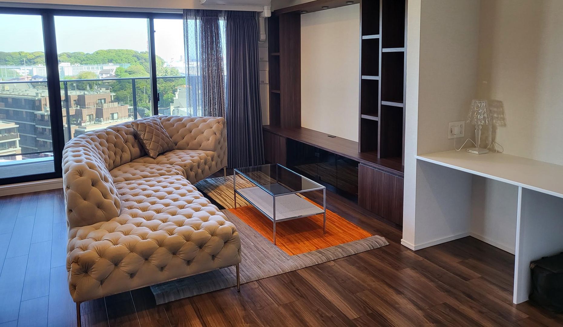 組み合わせ自由なシステムソファは対面配置にも動かせたりと、間取りへの柔軟性はもちろんのこと、家族構成によってもカタチを選べる優れものです。オーダーカラーのサンドはあたたかみがあり、床やカーペットともよく合っています。