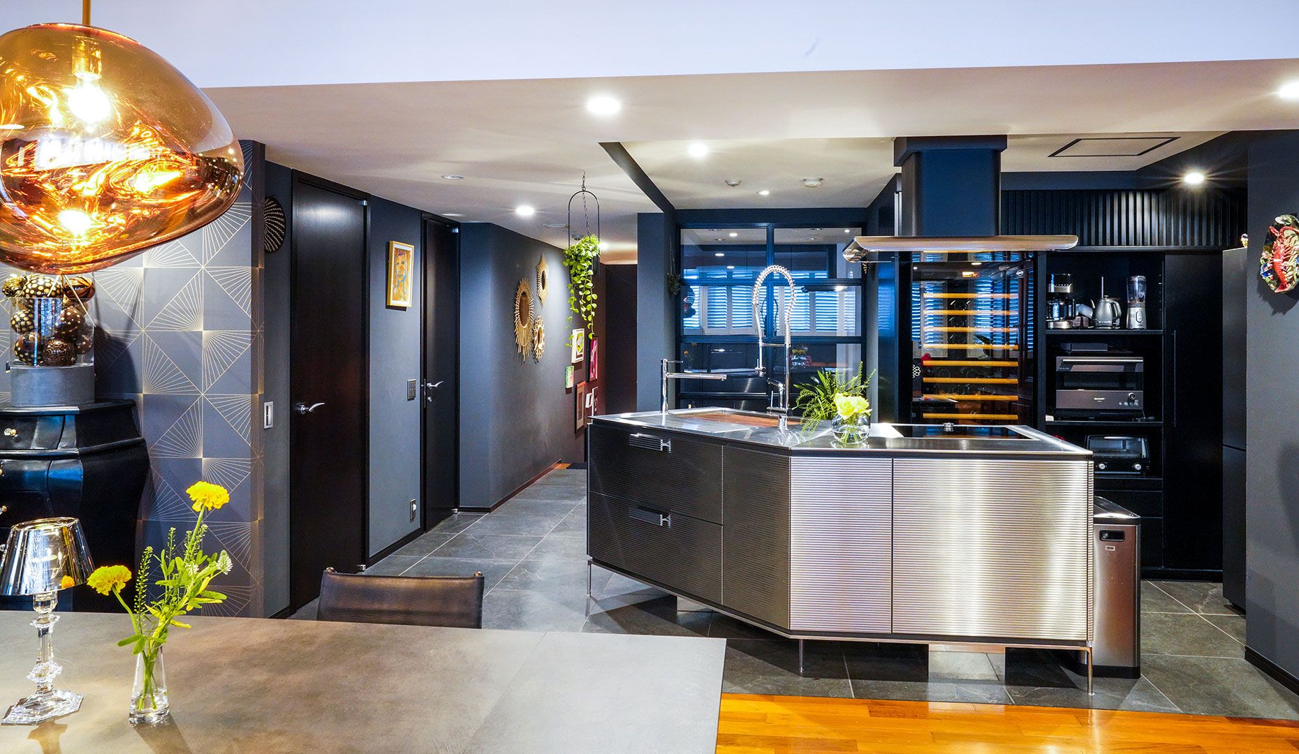玄関から続くLDKの主役は、135度の角度をもつ究極のゼロ動線キッチン®「iNO V-LAND」。その個性的なフォルムを活かすため、入居前には大胆なリノベーションが実施されました。