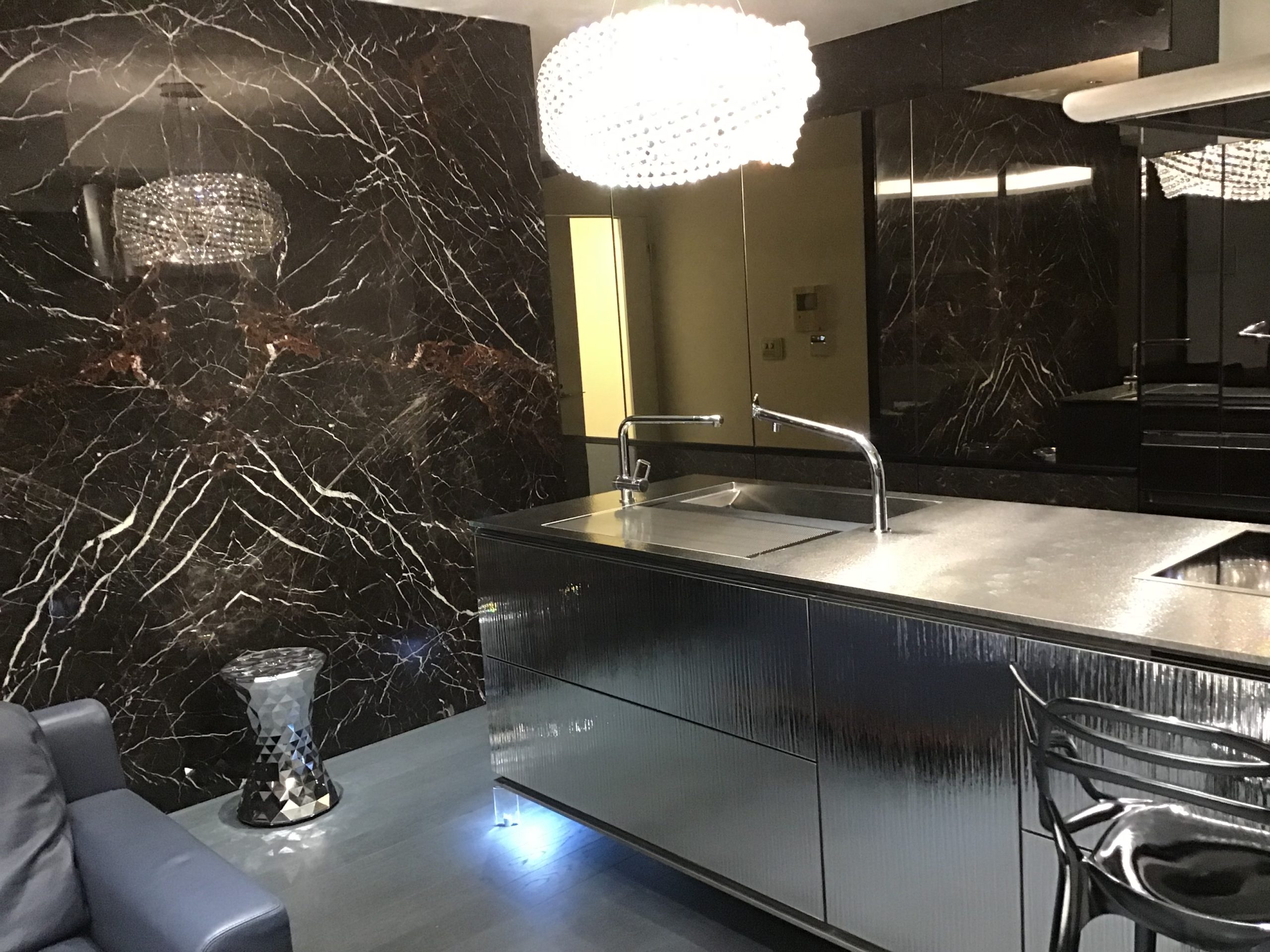 Kartellの人気スツール「ストーン」もクローム色を採用し、メタリックで統一された空間になっています。