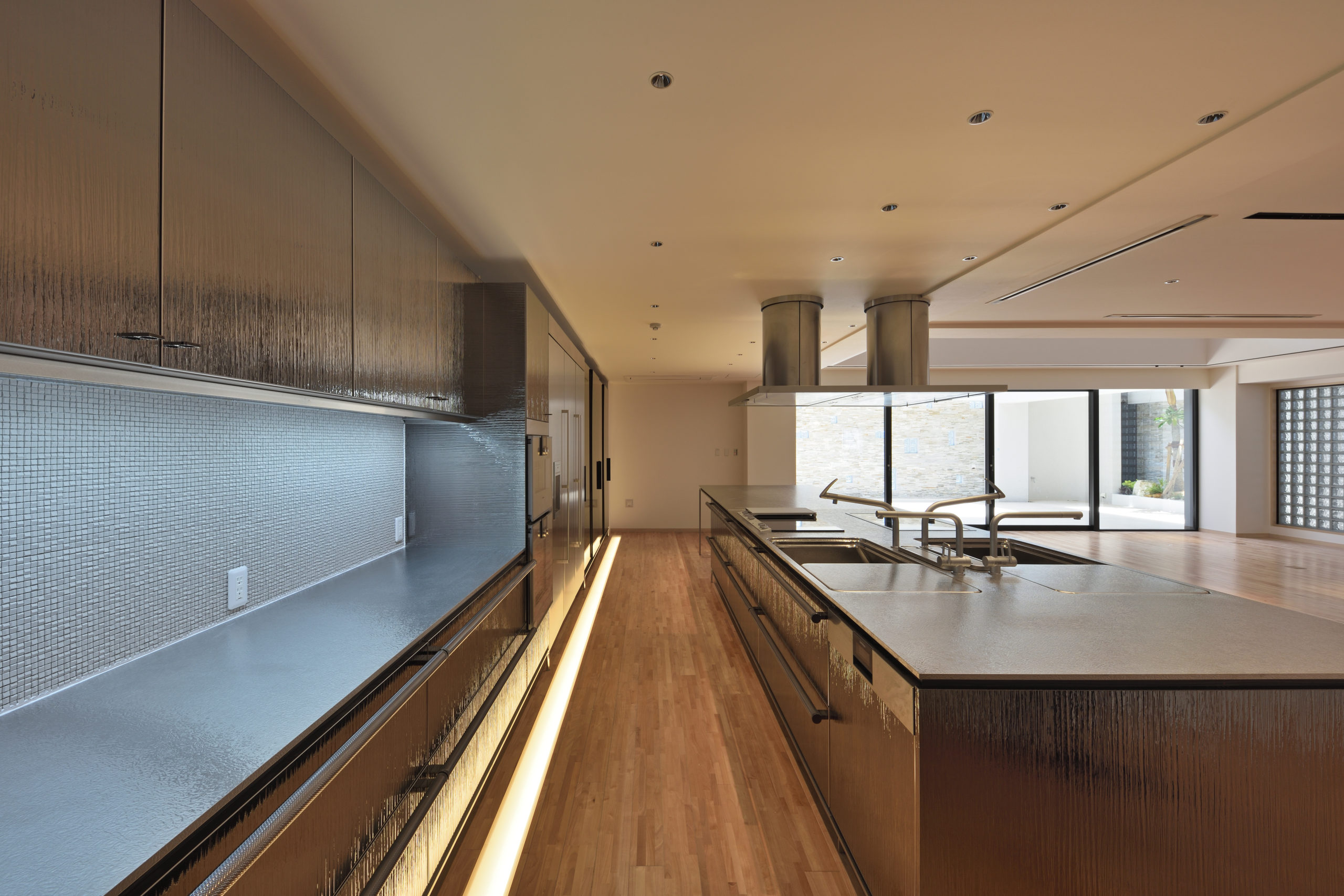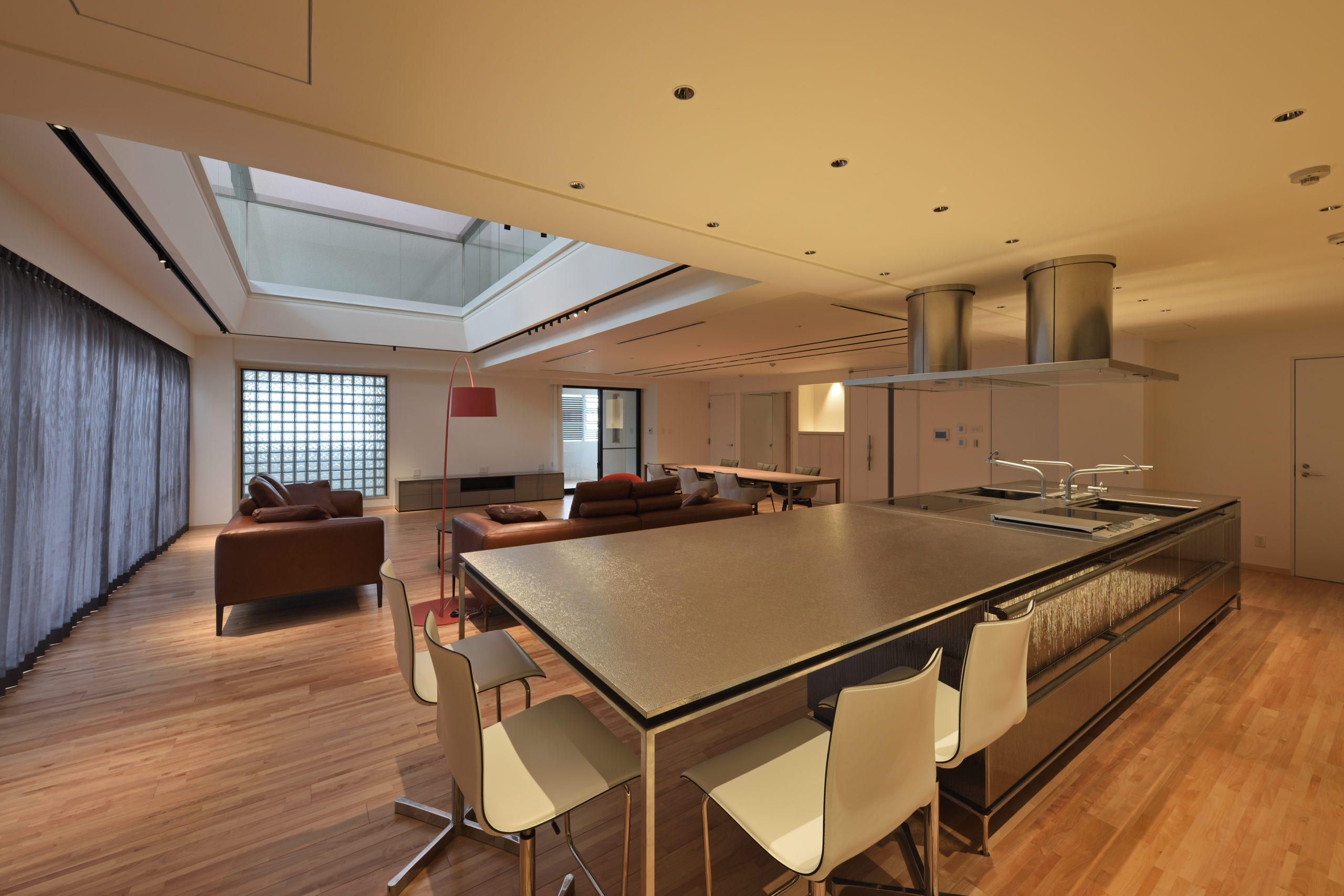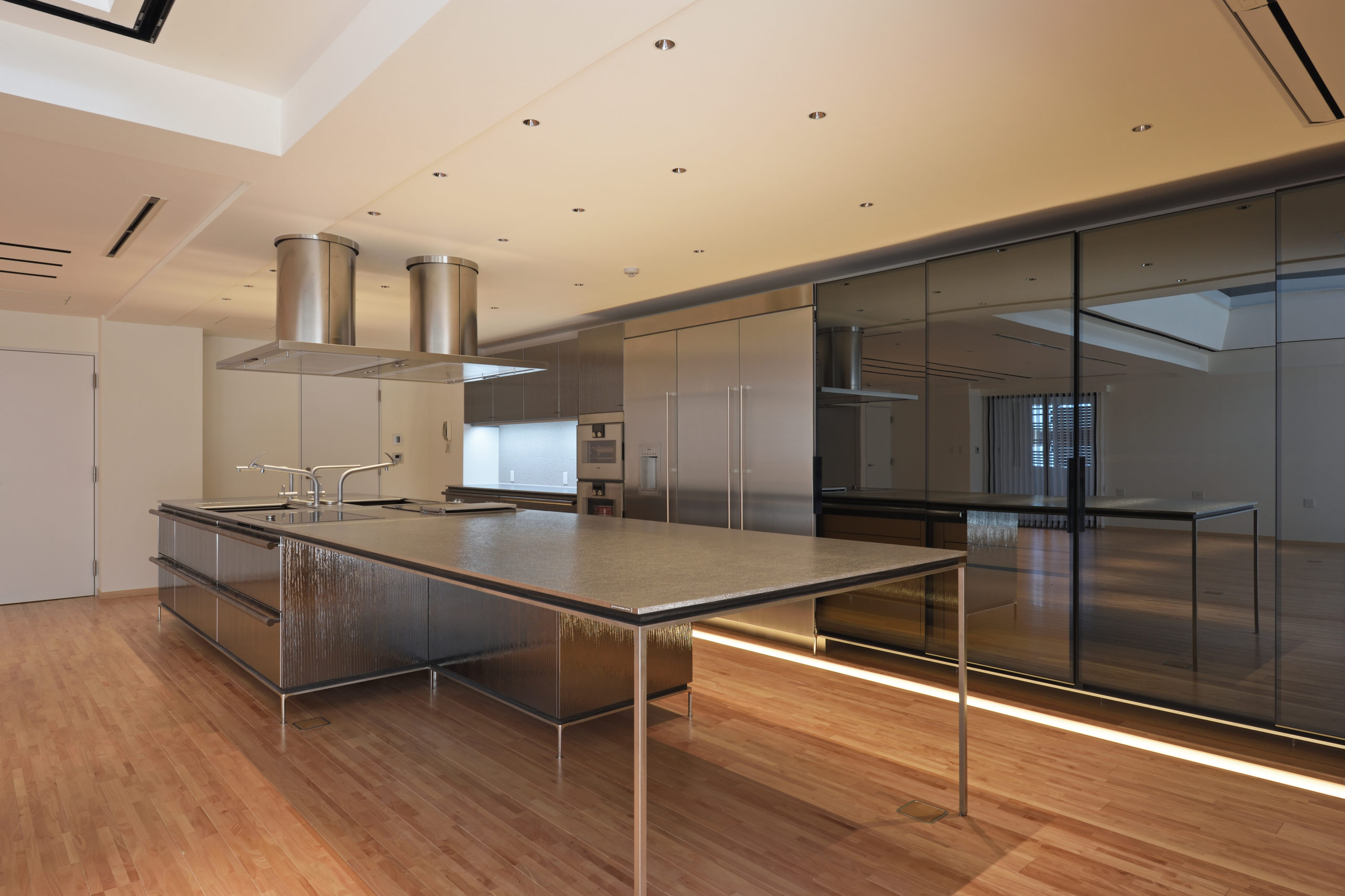 メガキッチンがリビングダイニングの中心的存在になるように配置されています。キッチンを中心に家族や友人、様々な人が集い語らい、くつろげる空間になっています。