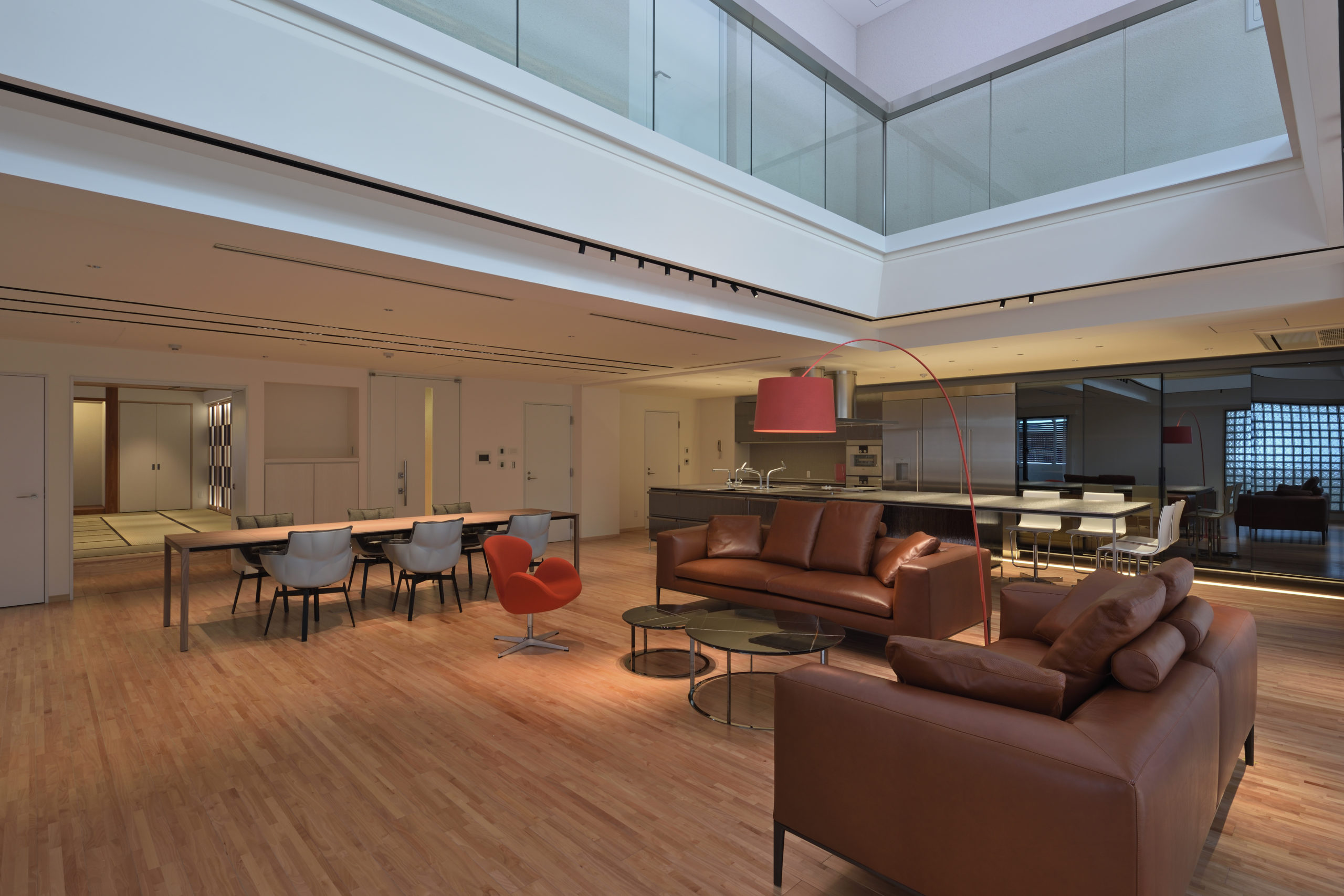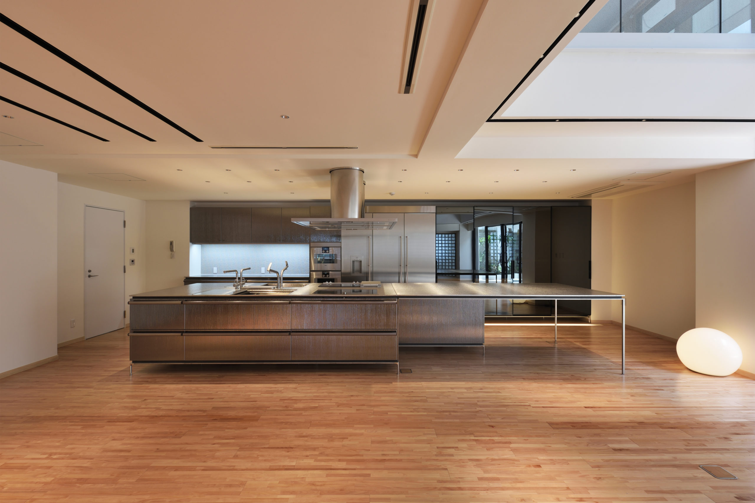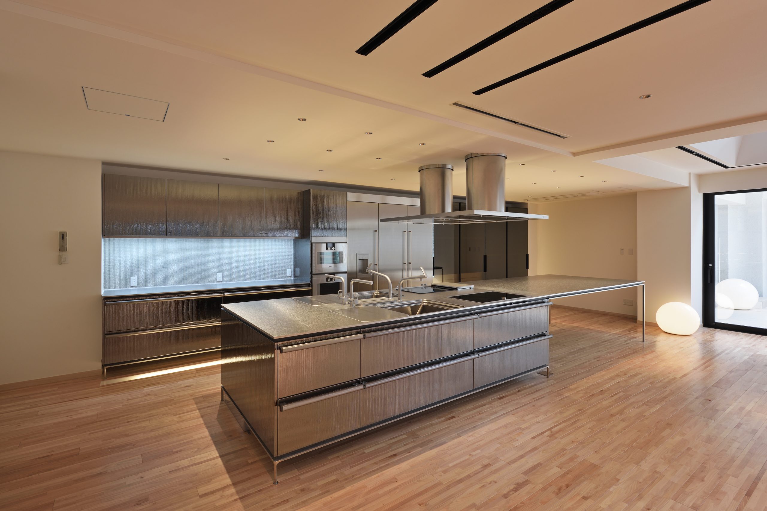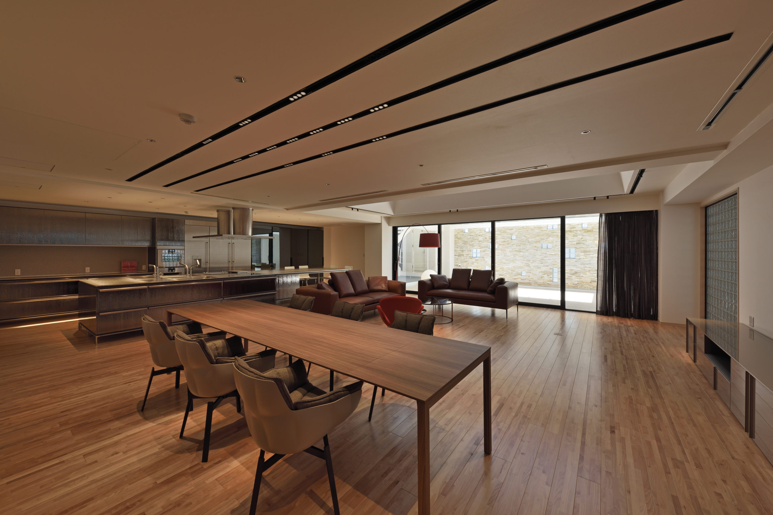 メガキッチンがリビングダイニングの中心的存在になるように配置されています。キッチンを中心に家族や友人、様々な人が集い語らい、くつろげる空間になっています。