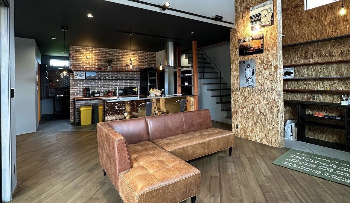 リビングや屋根付きテラスなどを眺めながら、調理ができるキッチン平面レイアウト。玄関を開ければすぐに広がるPOPでクールなリビングダイニングや、アメリカンな内装のOSBボードとのキッチン扉カラーが愛称良く空間に馴染んでいて、友達が遊びに行きたくなるようなお家です。