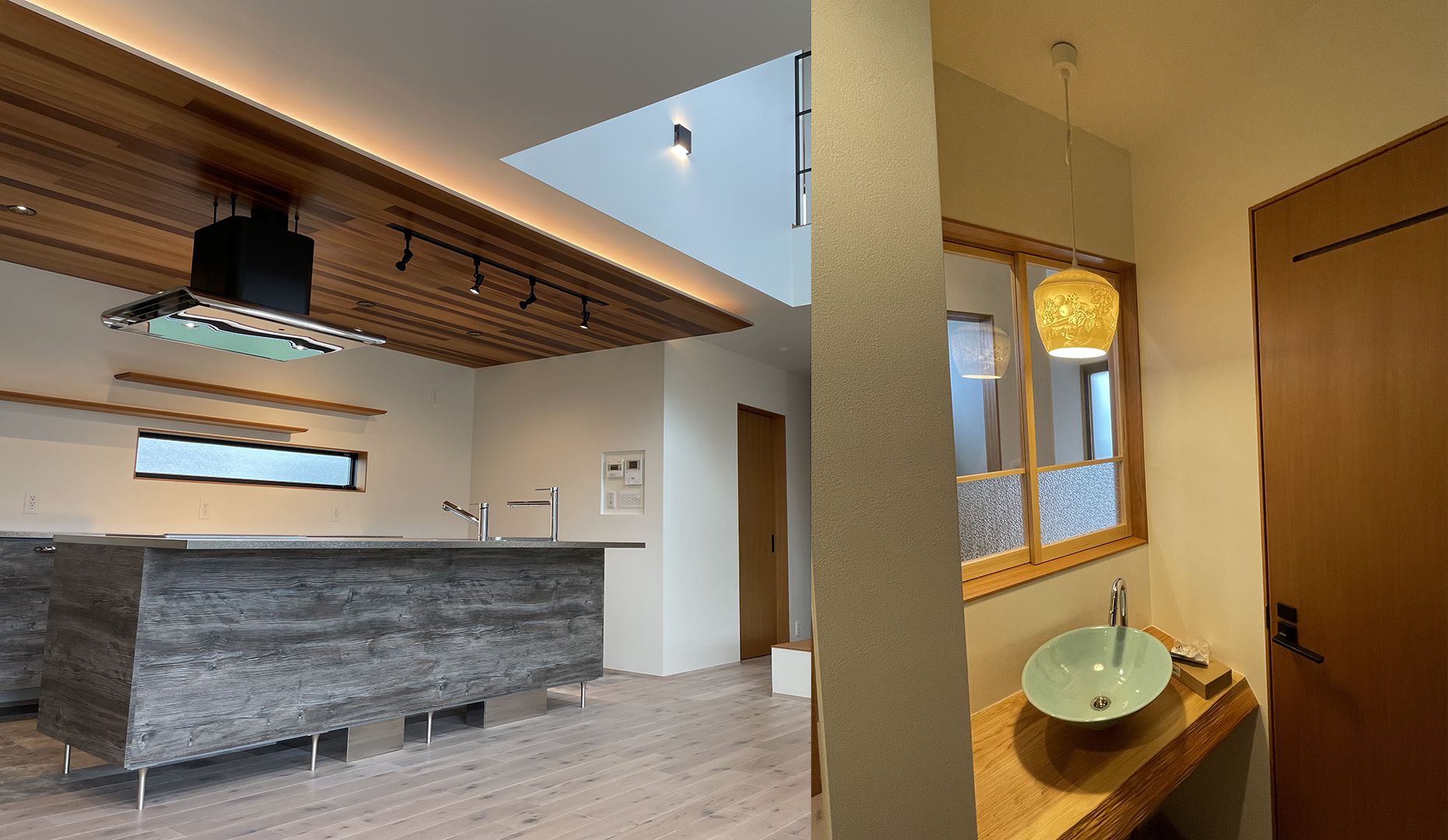 10年前にご主人の実家の2階に当社キッチンを採用していただいたことがきっかけで、使い易いことから今回の新築で来館されました。ご夫妻ともフィールウッドダークの展示のイメージを気に入られ、C-LANDとI-LANDで検討。すっきりするI-LANDにされました。建築もご主人の友人とのことで後日一緒に来館され一緒にイメージ作りをされました。照明も拘り、グレイチェスシャンデリアを吹き抜けにどうしても付けたいとのことで、グレイチェスシャンデリアを吹き抜けに付ける為にご主人が部材を加工して取付られました。
