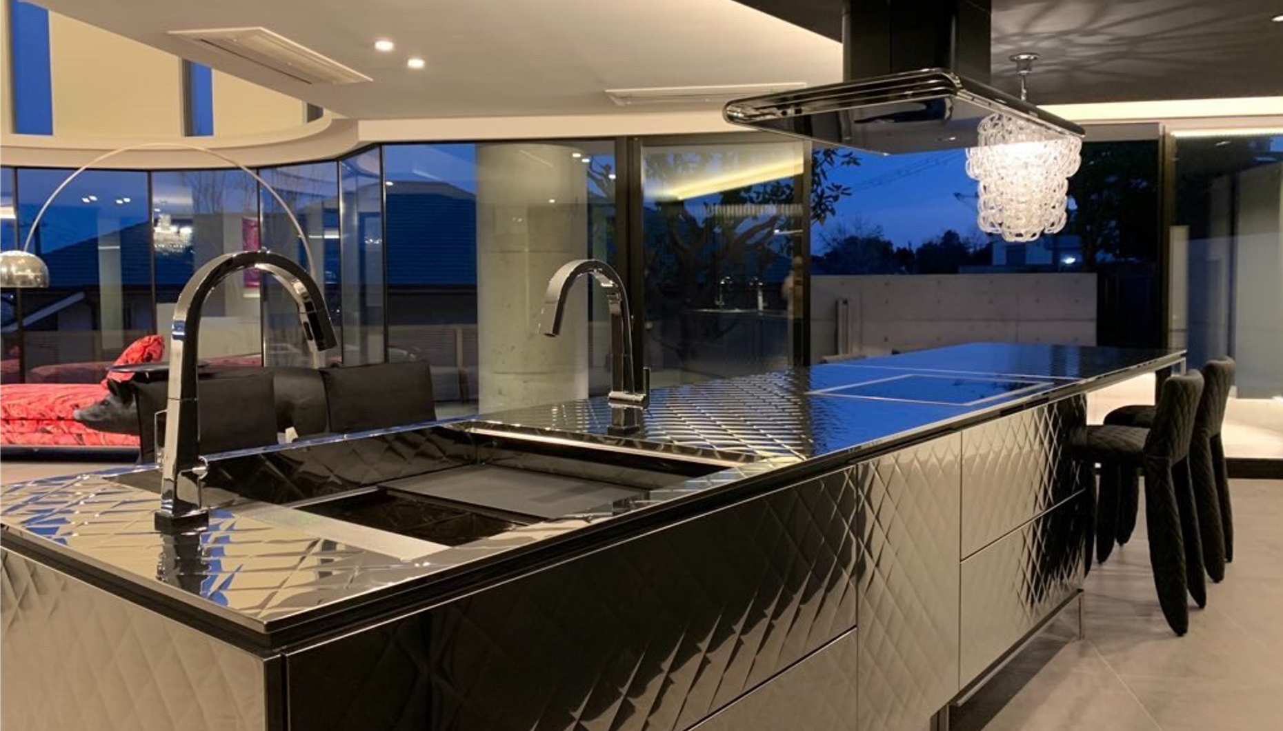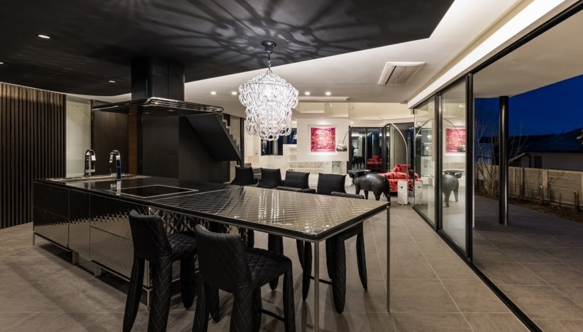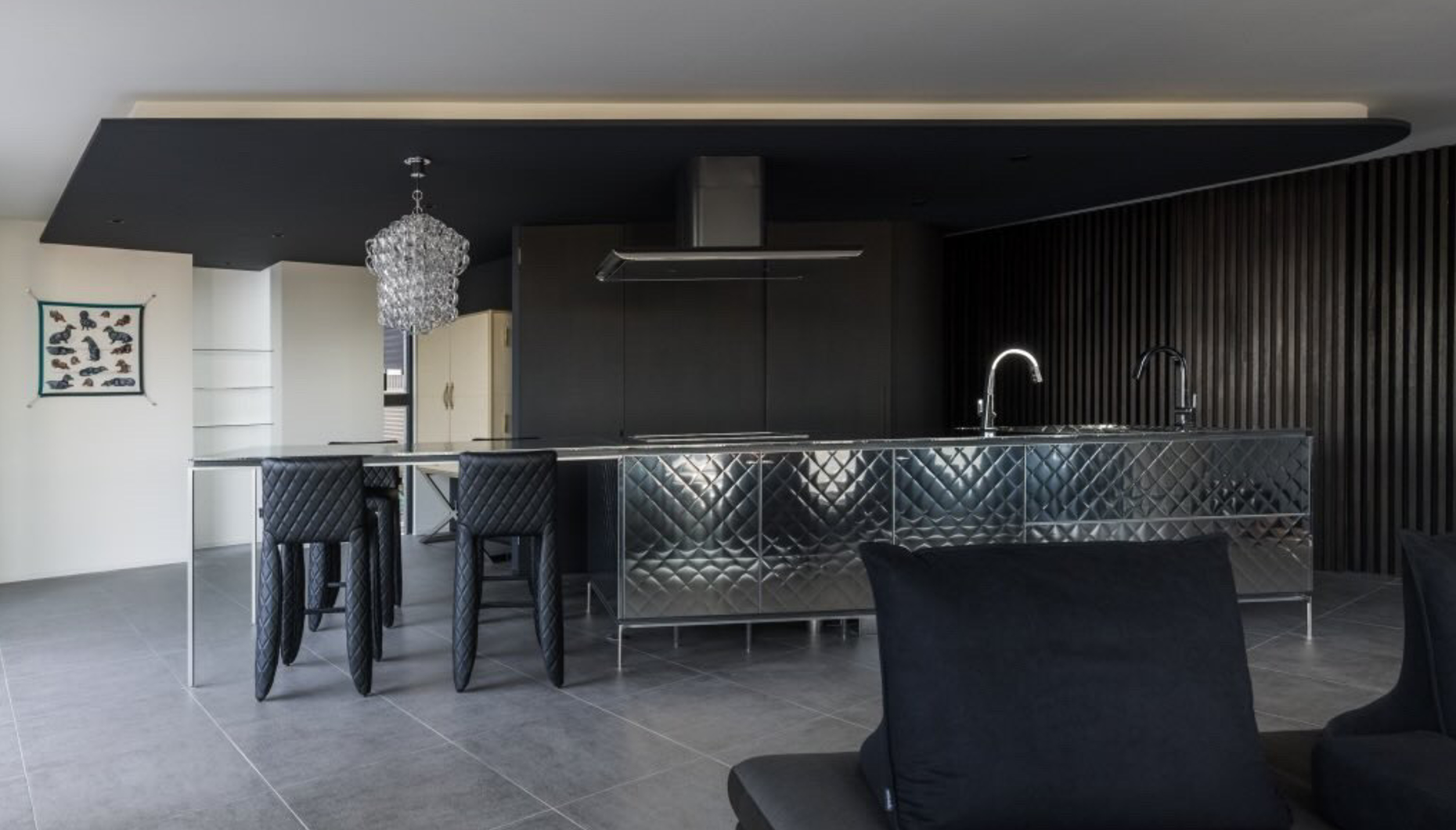 美術館のような空間に映えるジュエリーのようなキッチン。ファッション関係のお仕事をされているお施主様ならではのセンスが光ります。