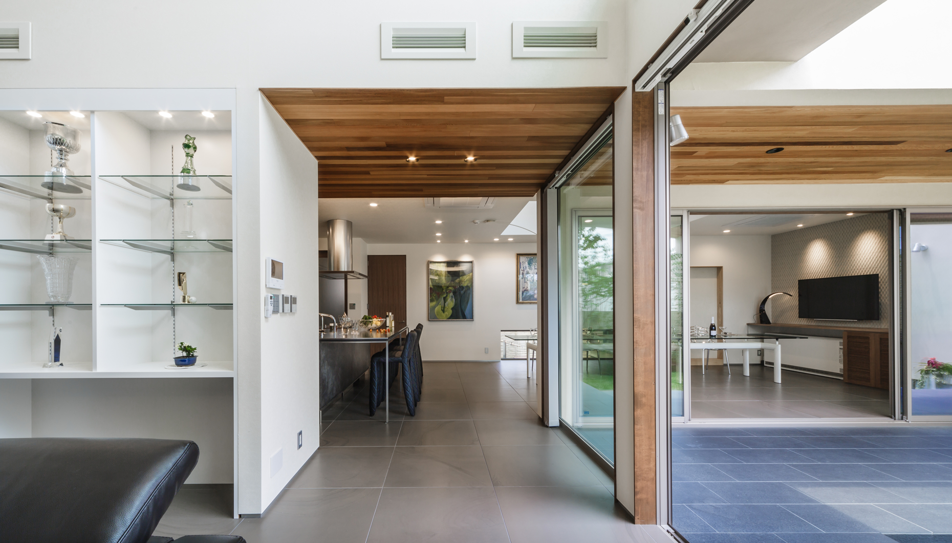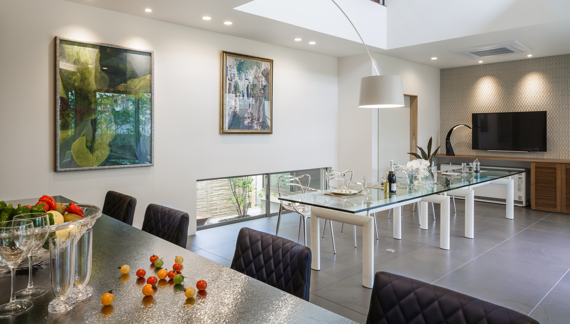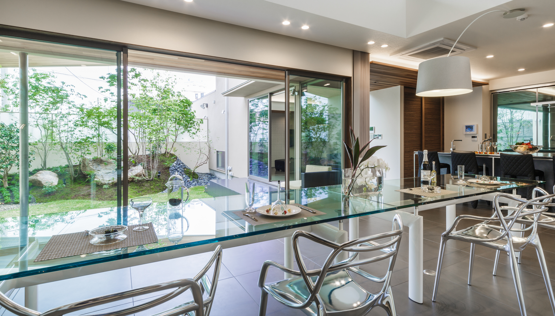 中庭の緑を見ながらキッチンでの作業ができ、またお料理が楽しめる開放的で素敵な空間です。