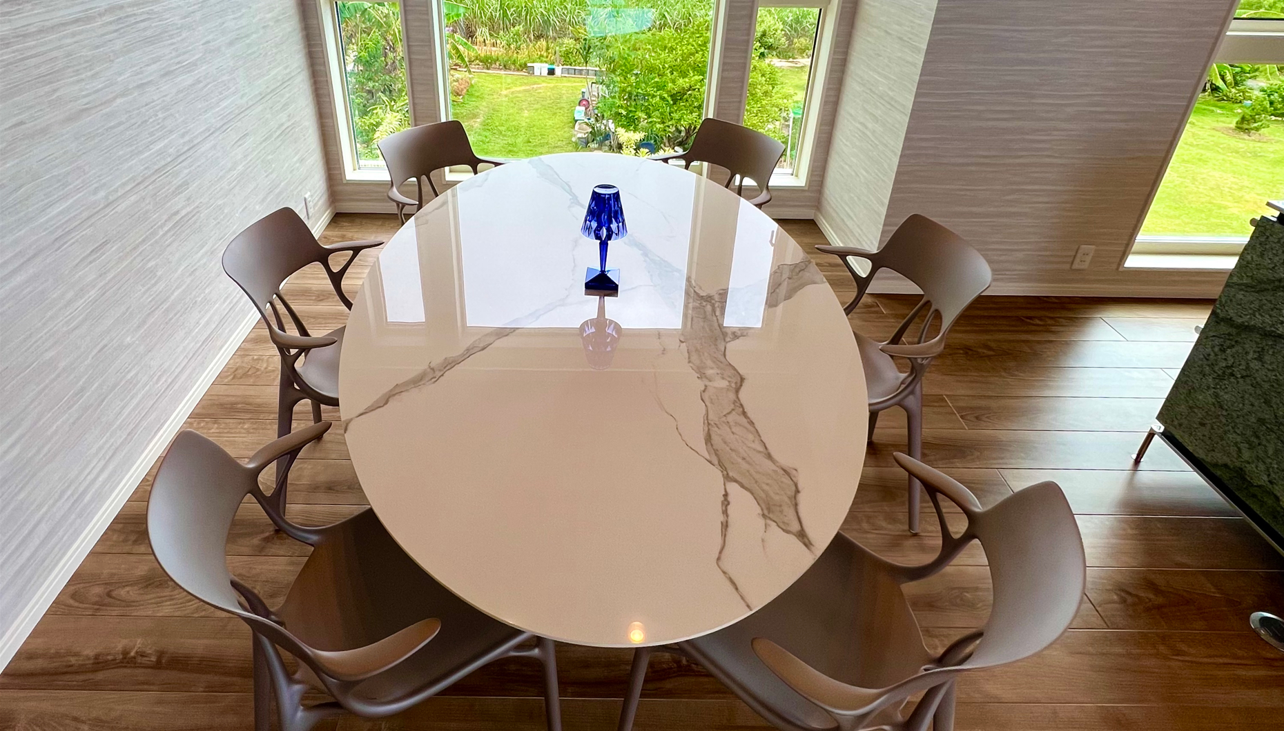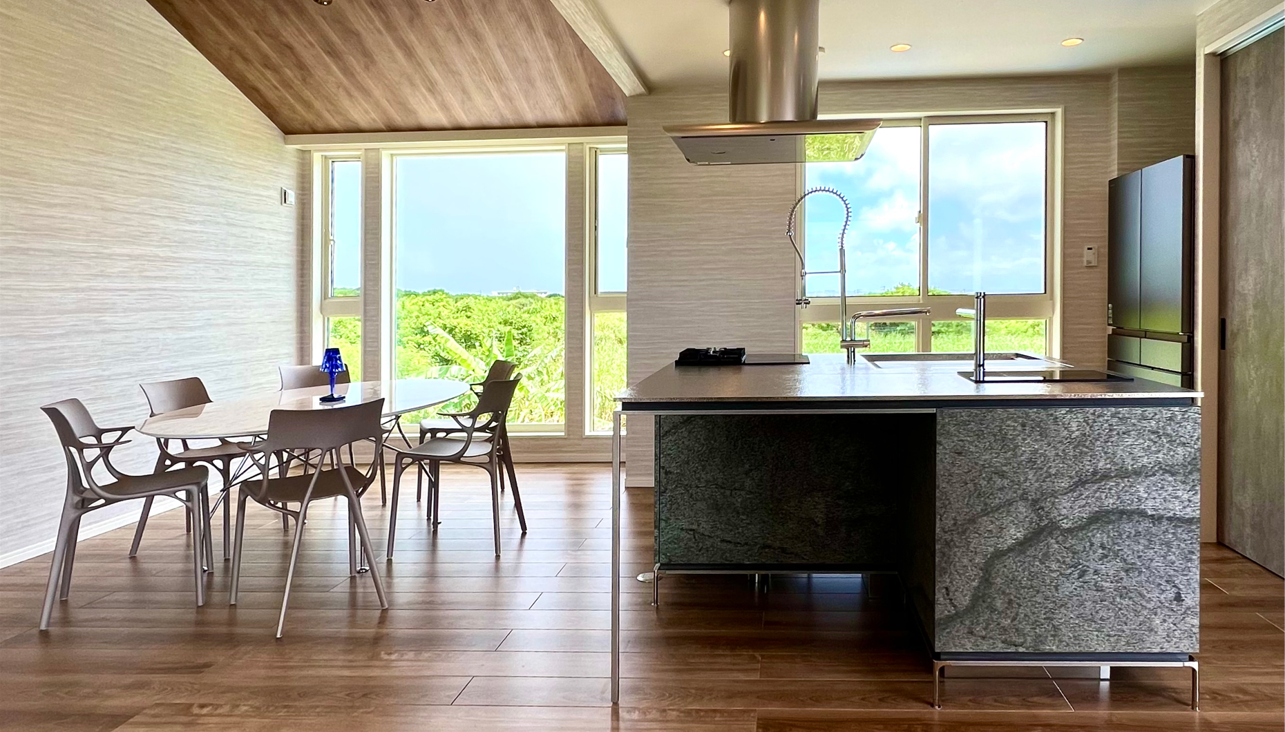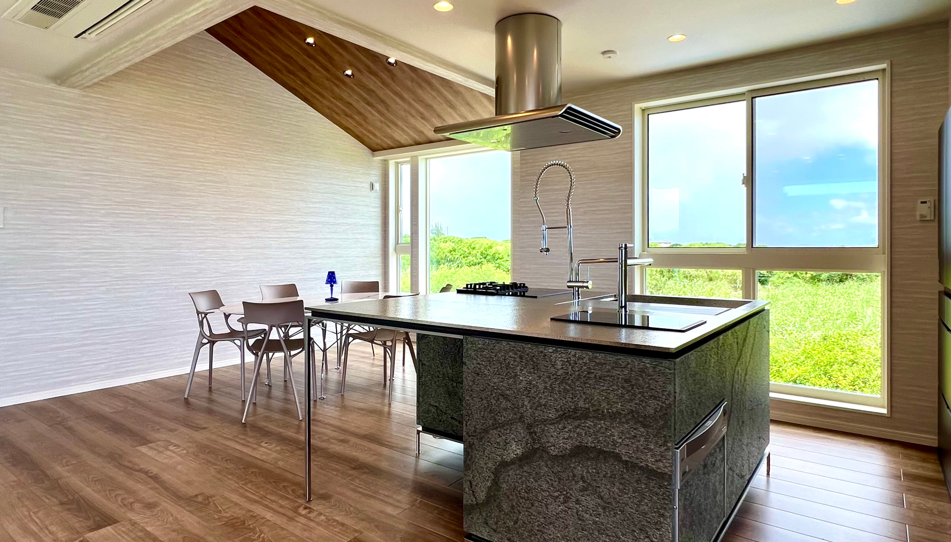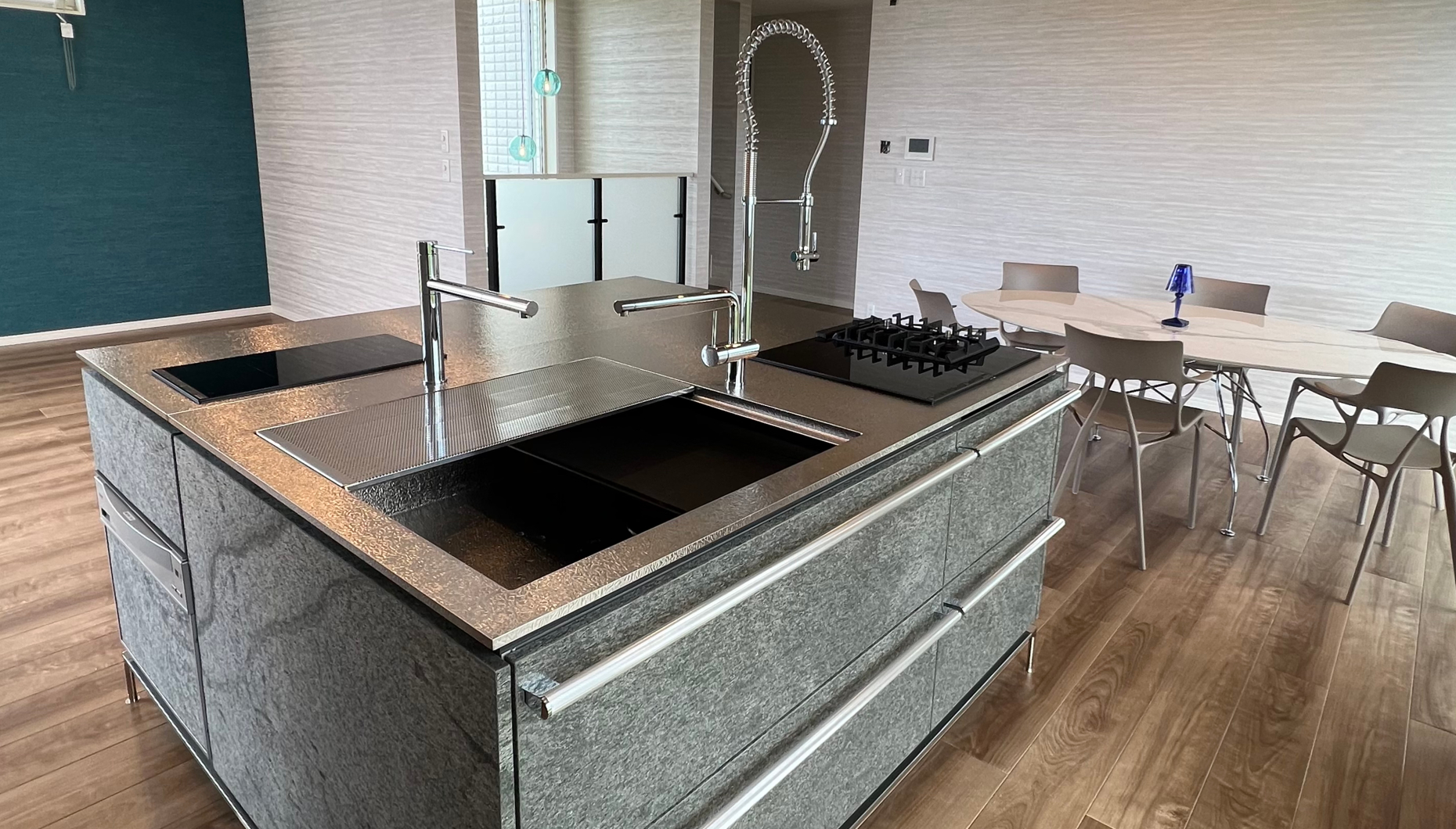 L型の中央にキッチンを配置するような間取りで、当初はペニンシュラレイアウトでしたが、リビングとダイニングとのスムーズな動線や視線が確保できるように360度アクセス可能なQ-LANDをご採用いただきました。