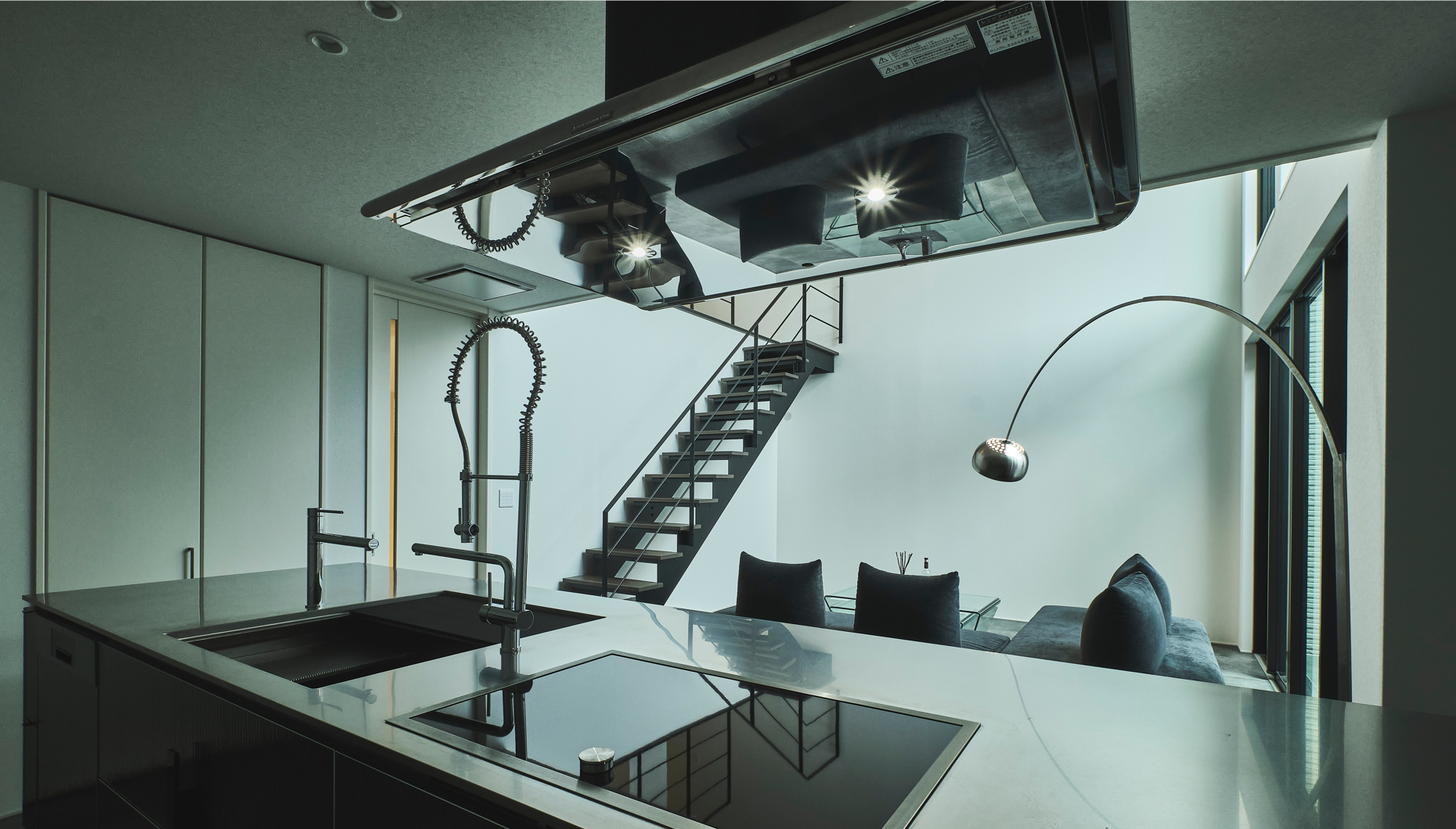 当初は、コンロを壁側、シンクをアイランド、アイランドの横にダイニングテーブルを置くという典型的な並列レイアウトでした。それをゼロ動線キッチンのCD-LANDでアイランドに集約して、リビングを広く取り、内装のデザインをシンプルに出来る事を大変気に入られてご採用いただきました。