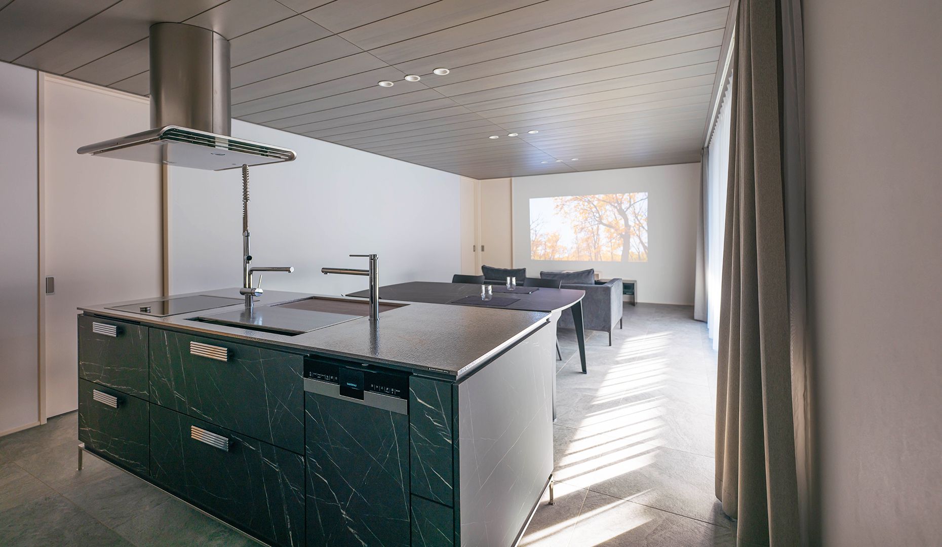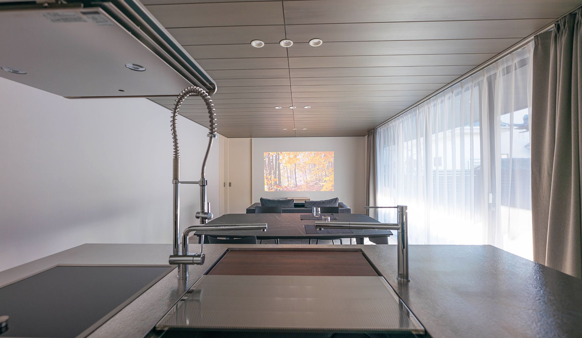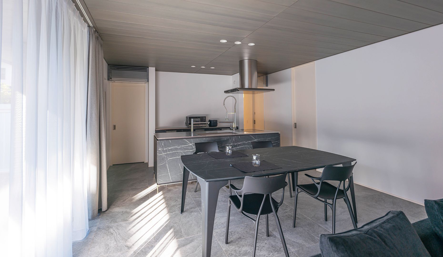 LDKをワンルームにする為、キッチンにはこだわりたいという強い希望があり、床のグレーのタイルに合わせキッチン扉もかっこよくブラックマーブルに。合わせてダイニングテーブル、ローテーブルもキッチンと同色でチョイスしていただき、全体的に統一感のあるモダンな空間になっています。