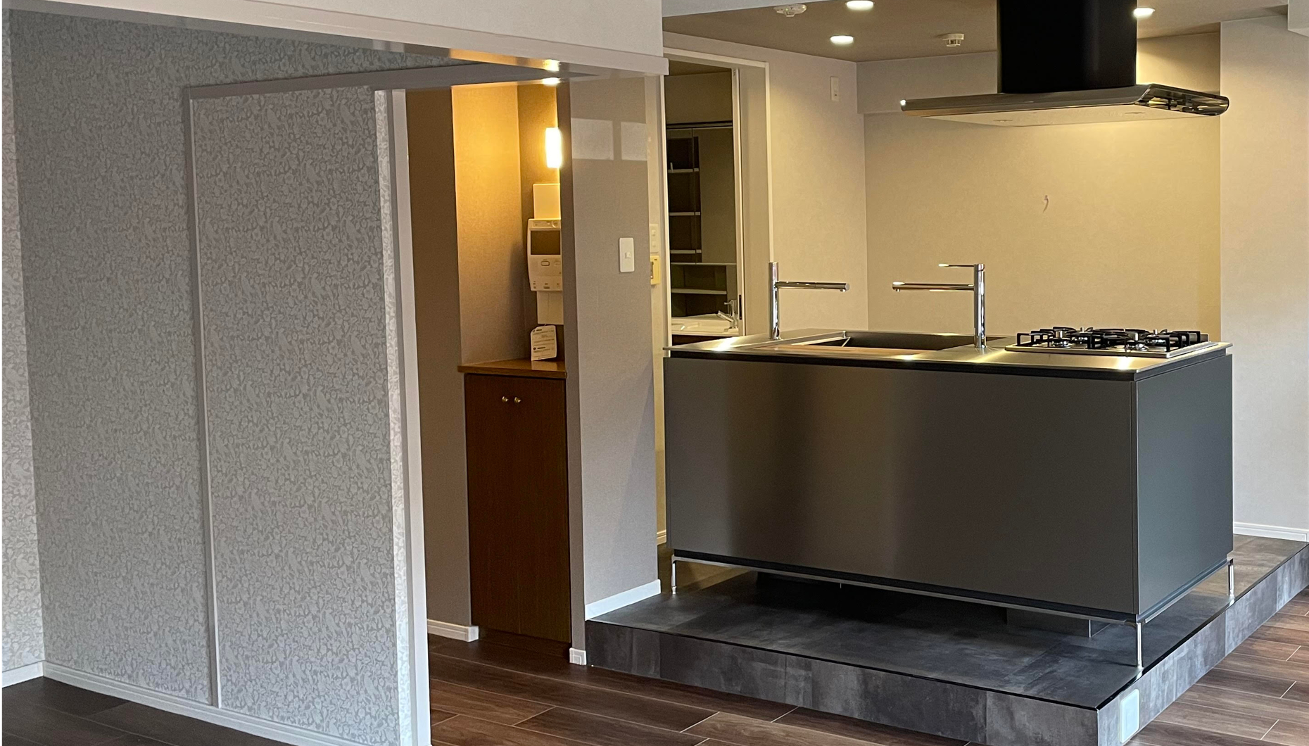 ご夫婦二人暮らしのフルリノベーション。キッチンの配置を変え、コンパクトなゼロ動線キッチンを採用したことで、全く違ったイメージのお部屋になりました。