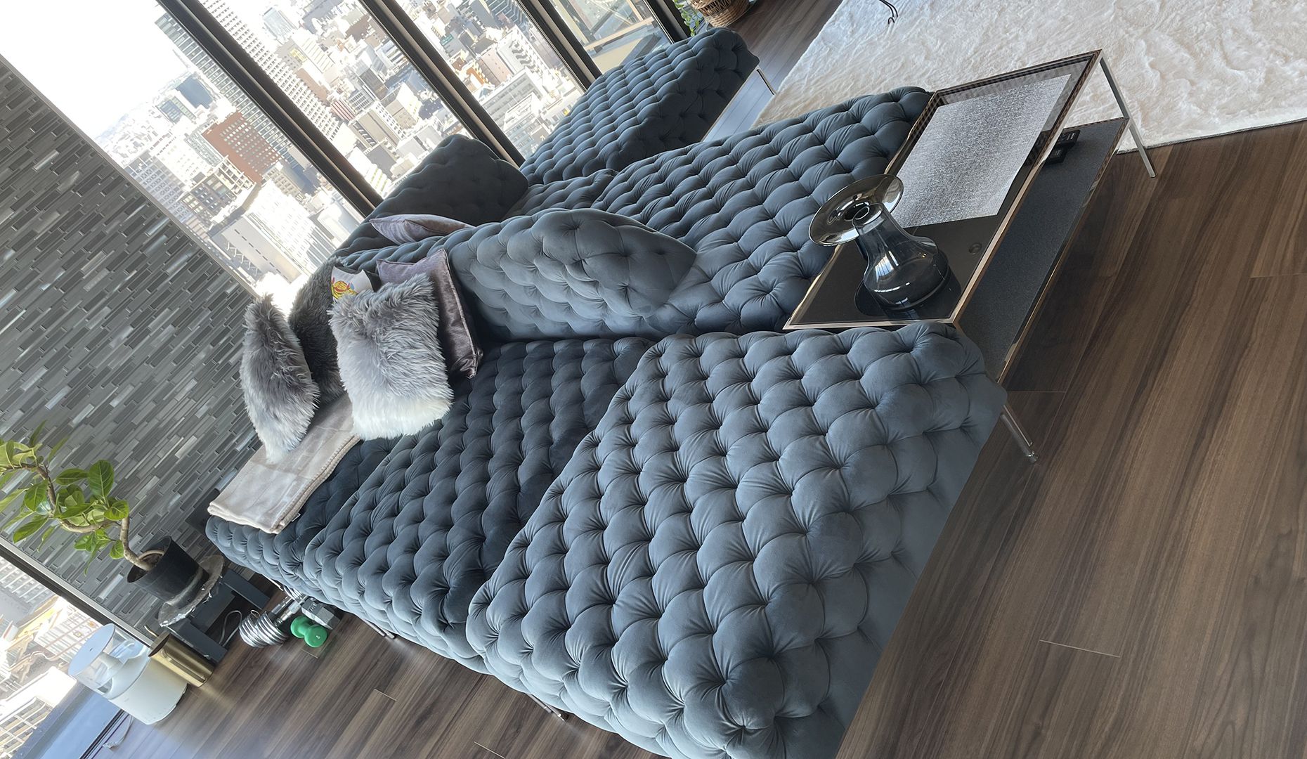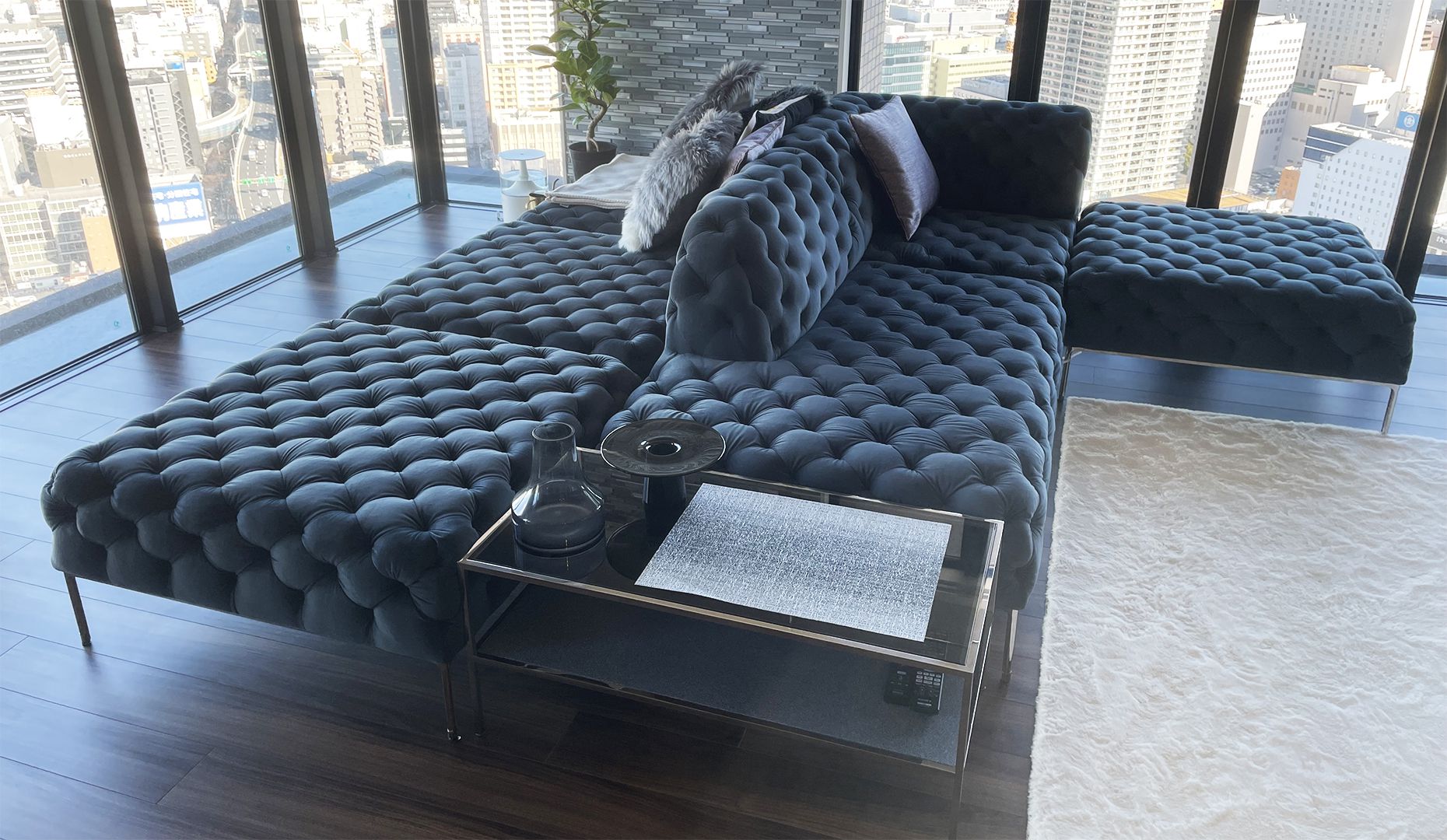 タワーマンションの眺望がすばらしいお部屋に、集(つどい)ソファ6点と集カフェテーブルをうまく組み合わせて360度から座れるソファになりました。