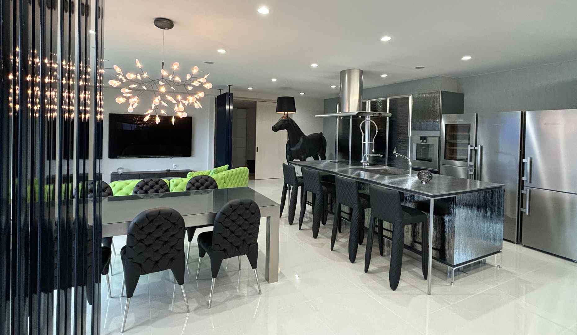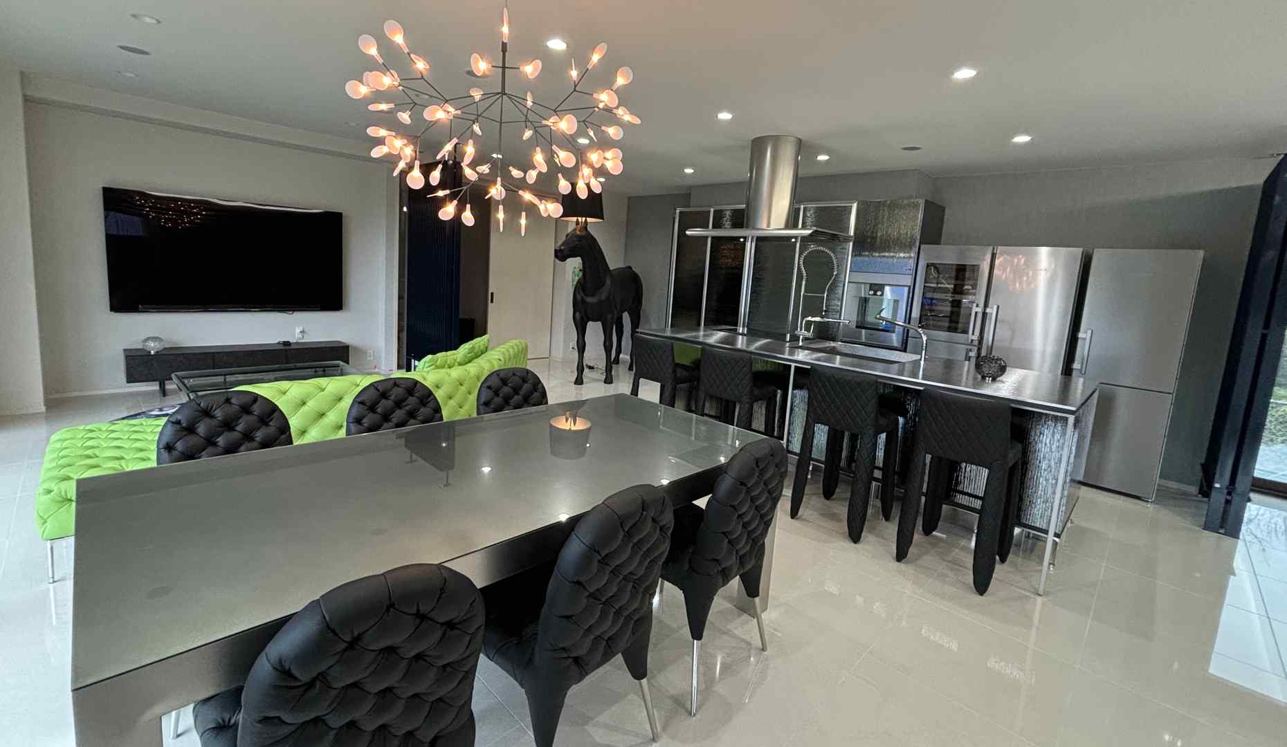 ご夫婦ふたりの暮らしを楽しむための、モダンでスタイリッシュな住まい。玄関からLDKに入ると早速、ご主人のお気に入りのホ-スランプがお出迎え、LDK空間の一番奥まで見守ってくれています。