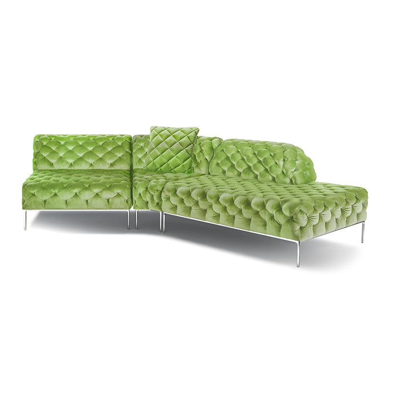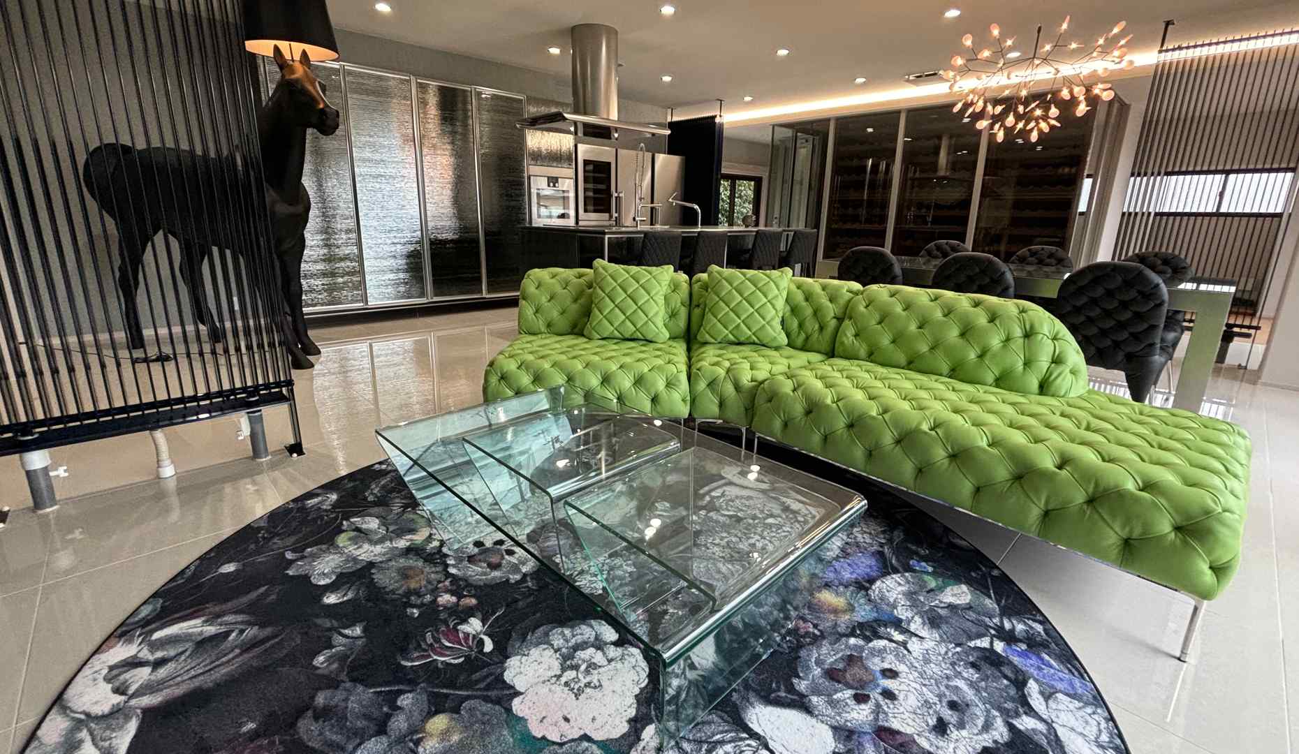 カーテンを通して、明るい陽ざしが迎えてくれる。そんな心地よい大空間の中に、堅牢なイメ-ジのステンレスにしっとりとした手触り、極限までふっくらと柔らかく仕上げてあるアップルグリーンの集(つどい)ソファ。大理石ホワイトマーブルの床との相性も良く、心落ち着くリフレッシュ空間になりました。