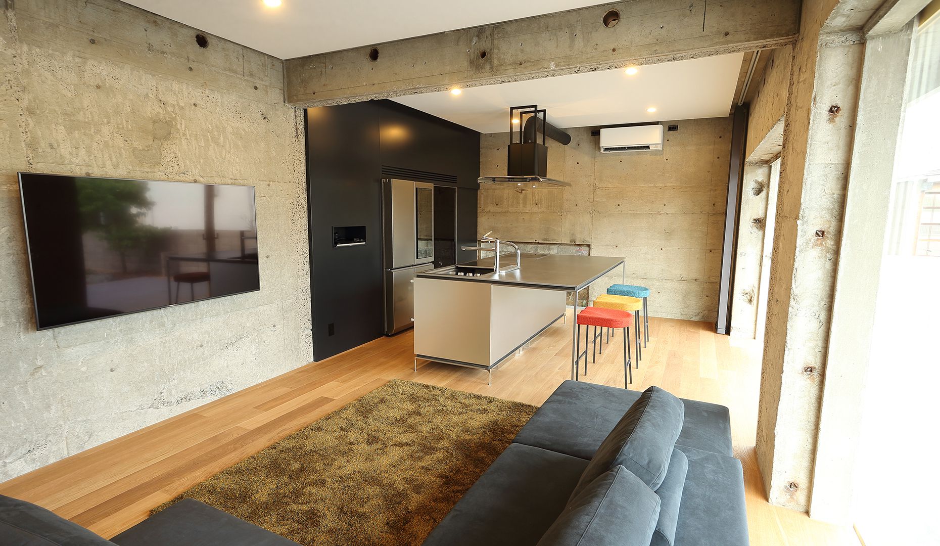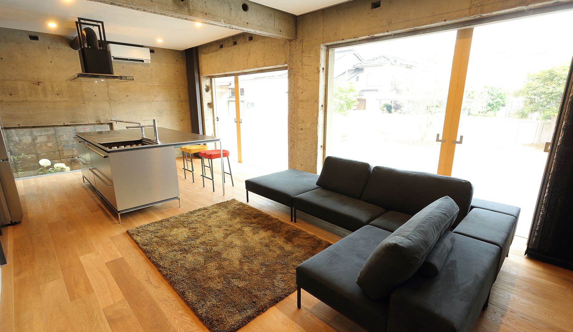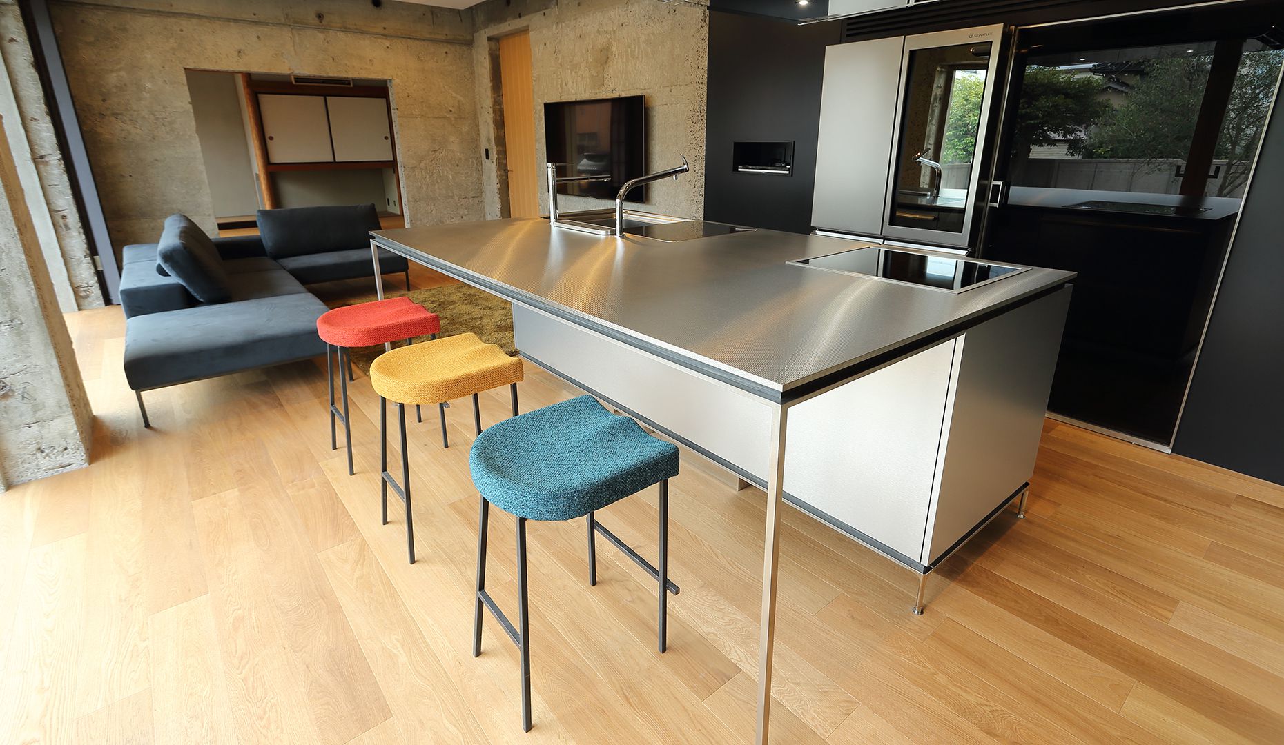 アイランドでRC造に合うメタリック素材のものを希望されており、INOを選ばれました。ダイニングテーブルを置かないキッチンはリビングと一体感のある空間になりました。