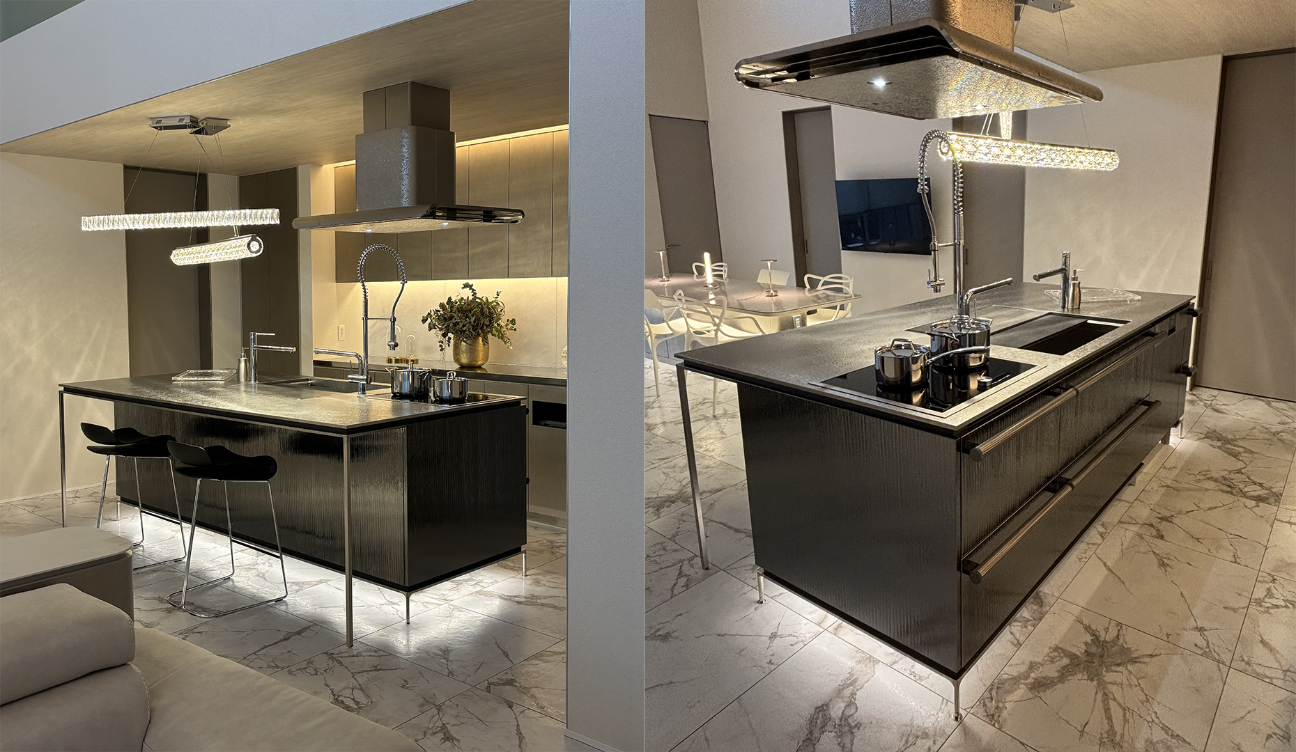 お子様が大きくなった時に、一緒にお料理やお菓子作りができる広いキッチンを探されており、奥様が一目ぼれされ採用いただきました。並んでも邪魔にならず、複数人でもキッチンを囲んでお料理ができることを楽しみにしておられます。テイストを合せてお選びいただいたチェアも空間にとても合い、柔らかな空間にスプラッシュブラックの扉が主張しすぎず、キッチンと照明が映えます。