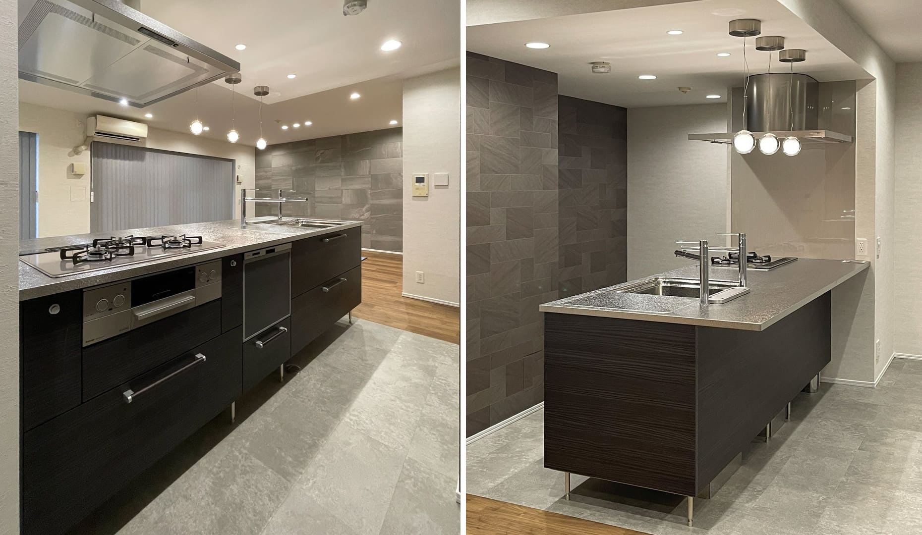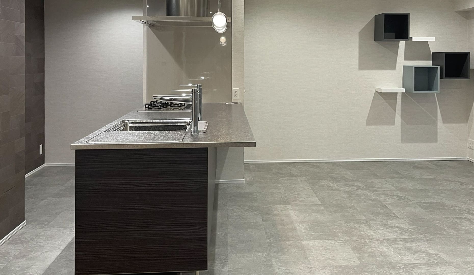 デザインは、空間をモダンに引き締める《ブラックオークグレイン》を。天板には、人気No.1の《エンブレムトップ アイス》を採用し、上質なキッチン空間が完成しました。