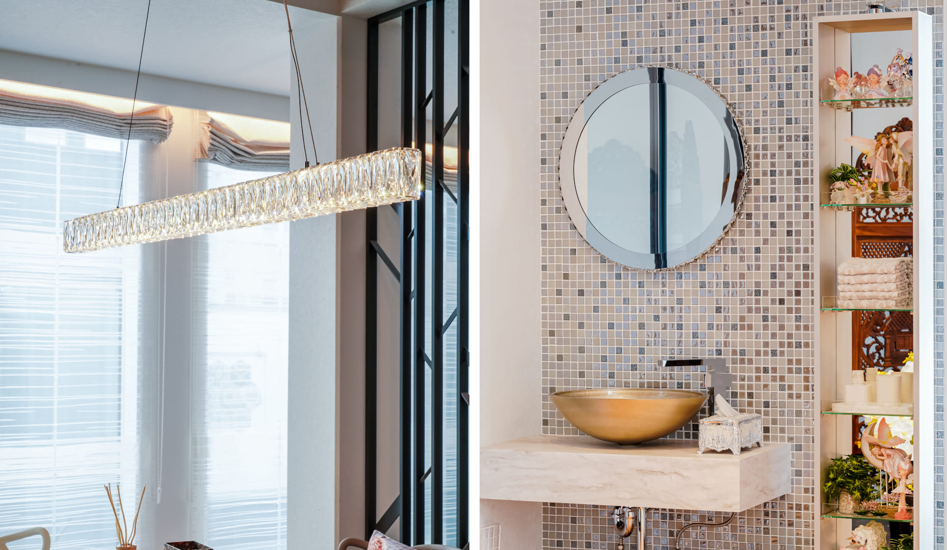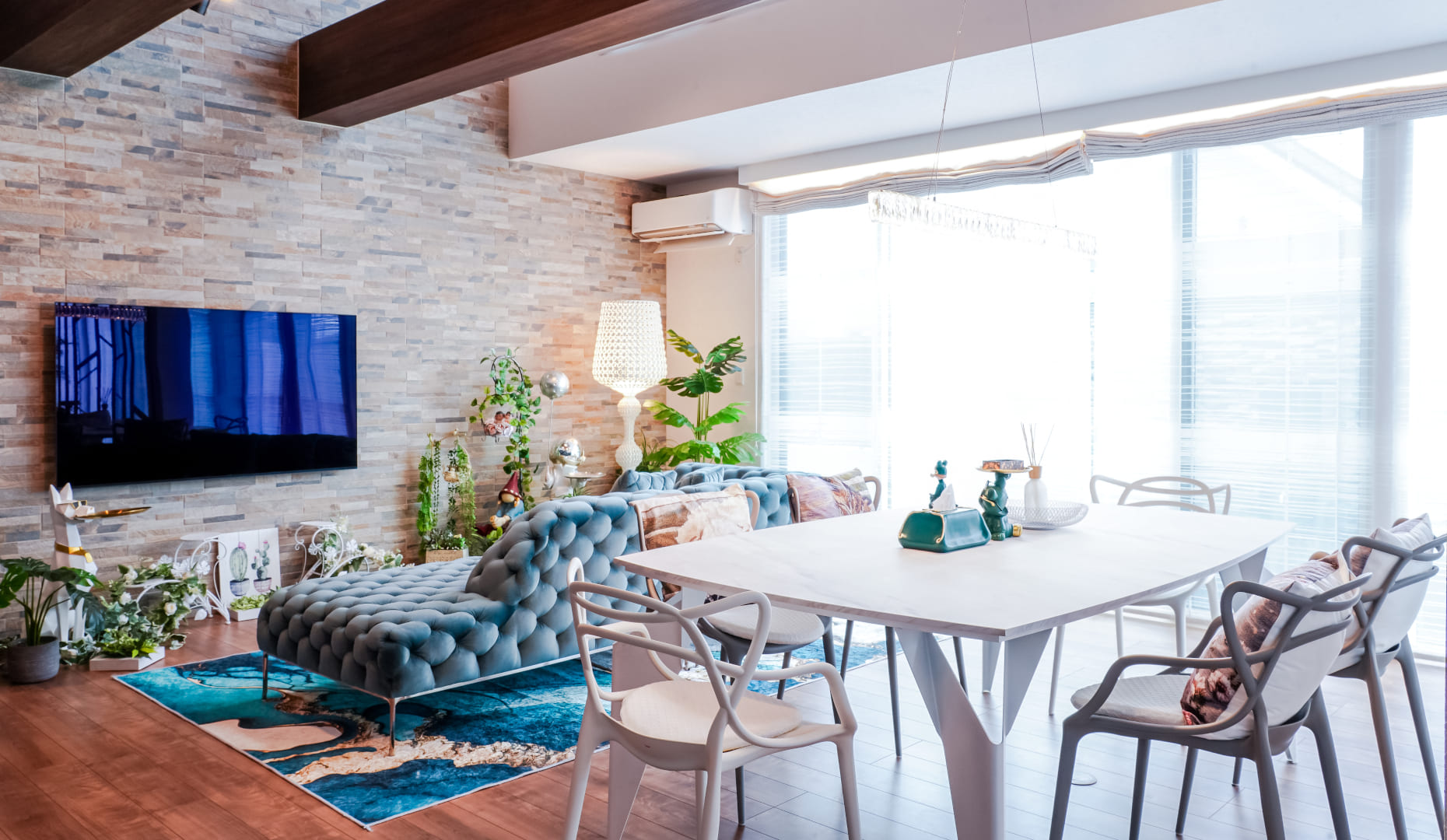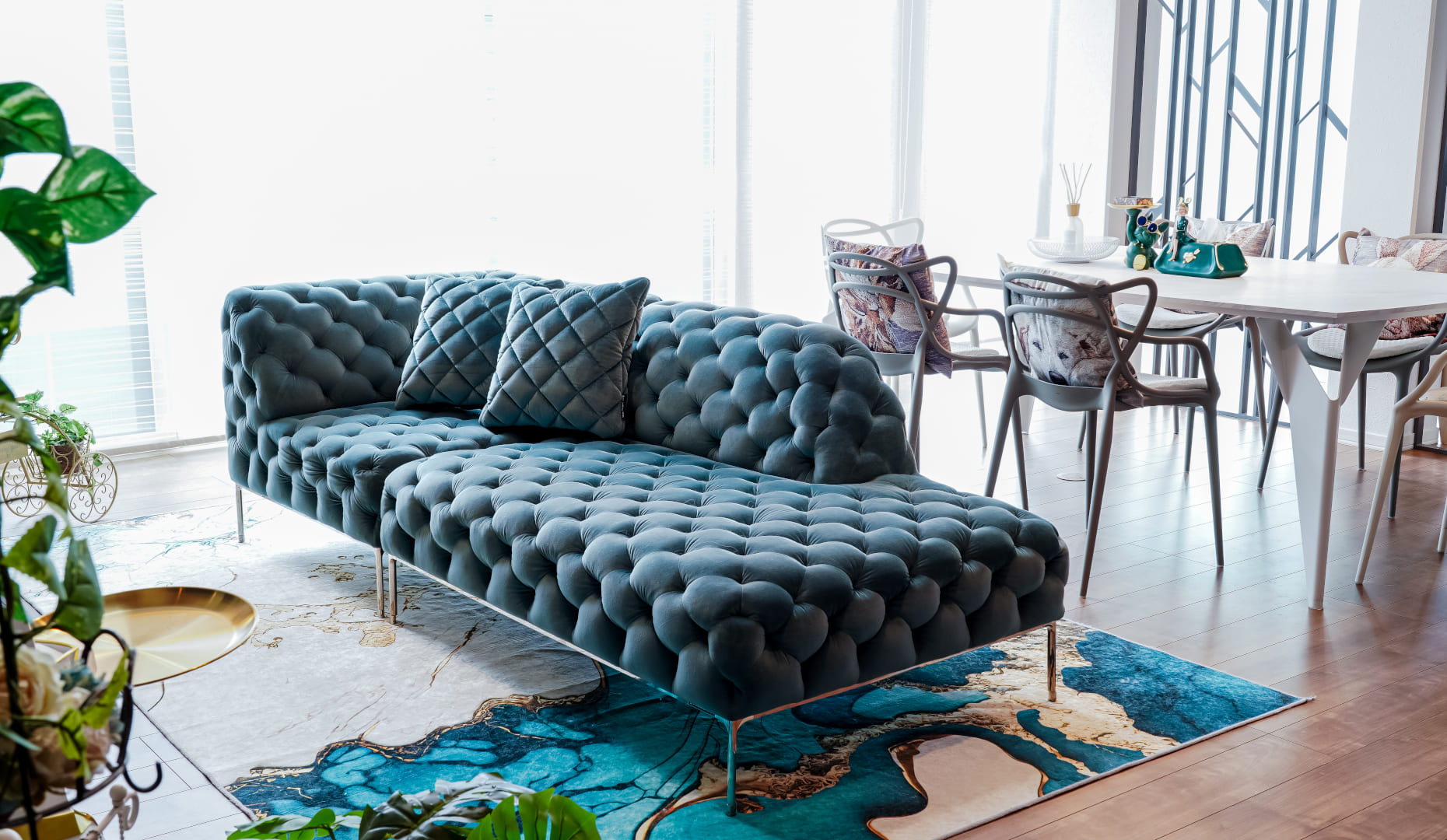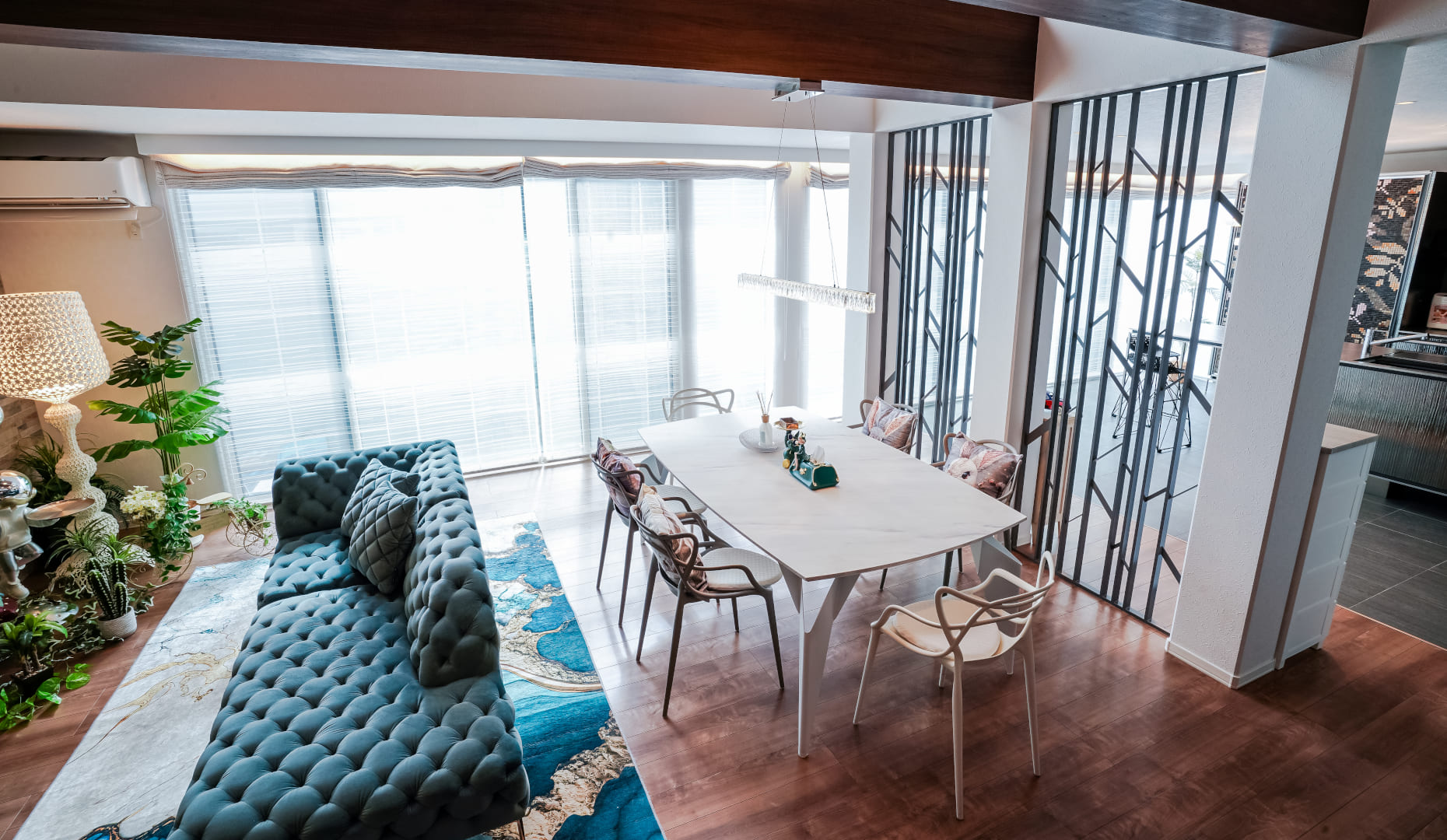 大容量収納「マイアミ」、ソファやダイニングテーブルなどのインテリアもトータルコーディネートされ、空間全体にエレガントな輝きが満ちています。