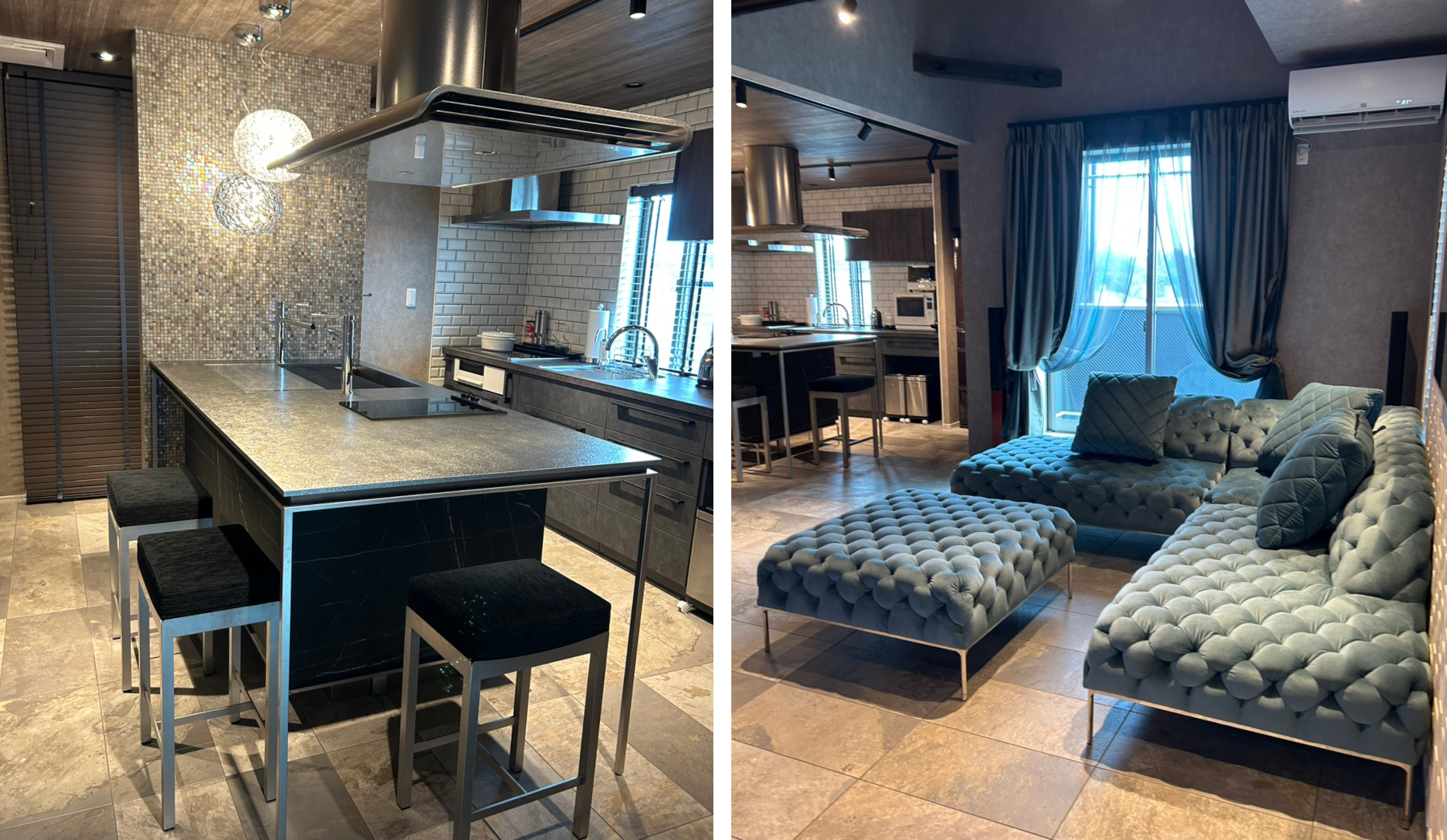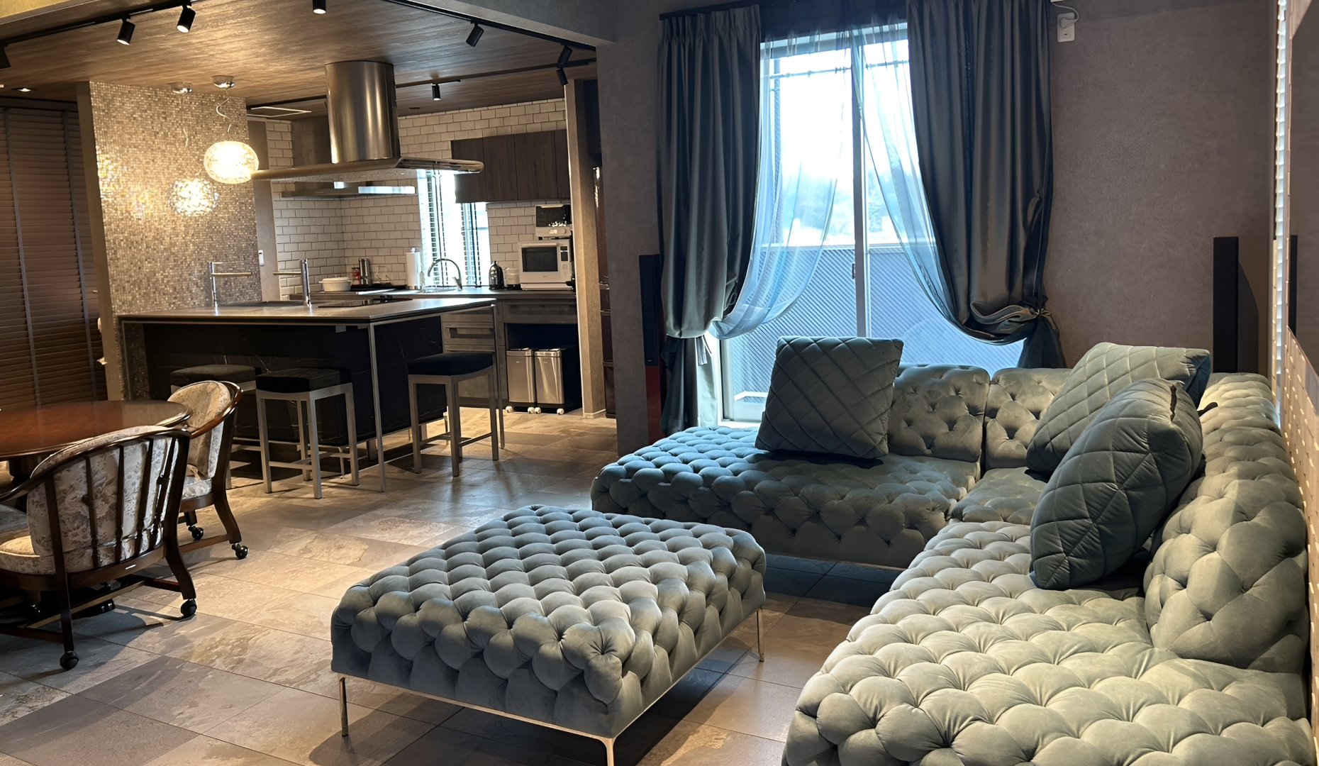 LDK全体でトータルで家具やタイル照明を含めたレイアウト。キッチンを含めて空間全体をそれぞれのインテリアが主役となっています。