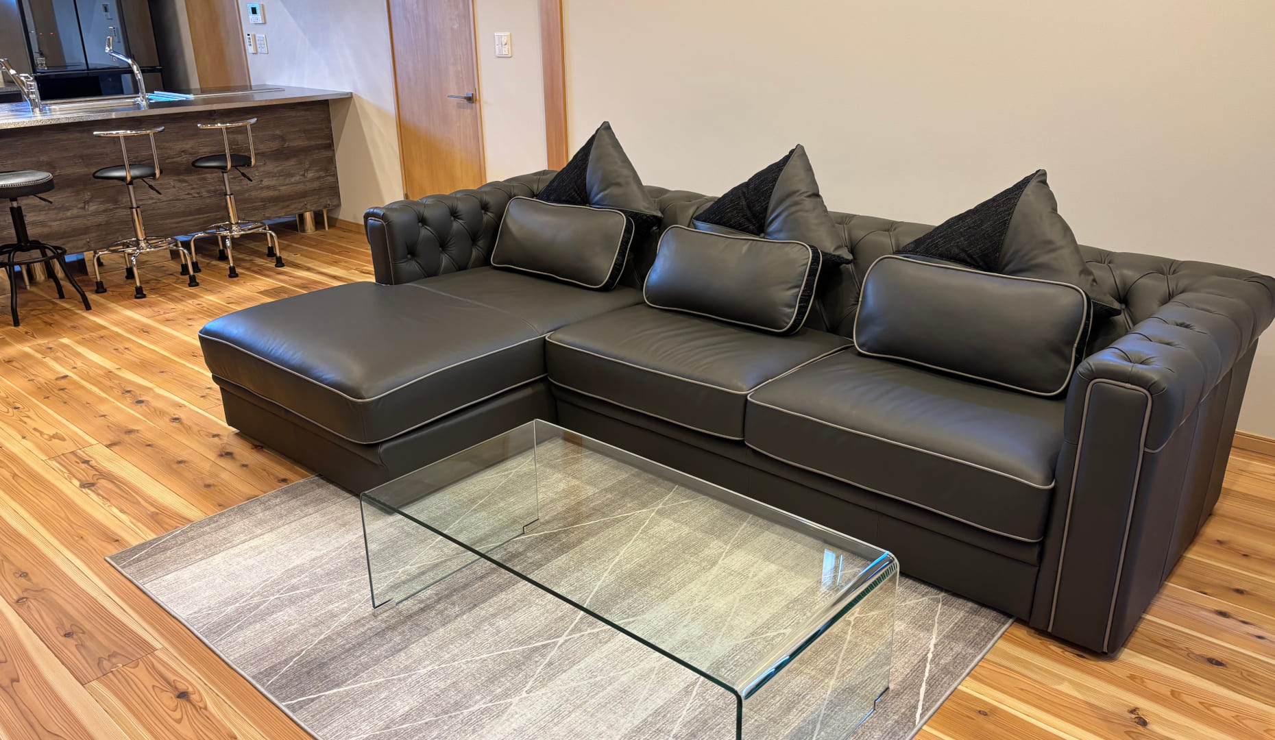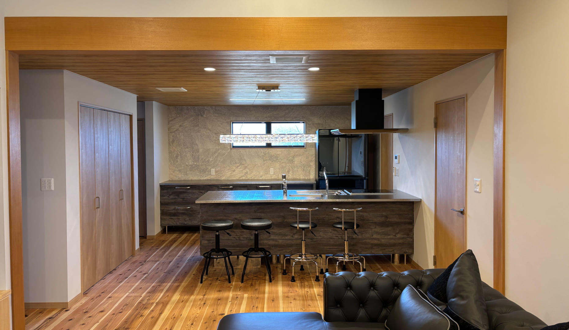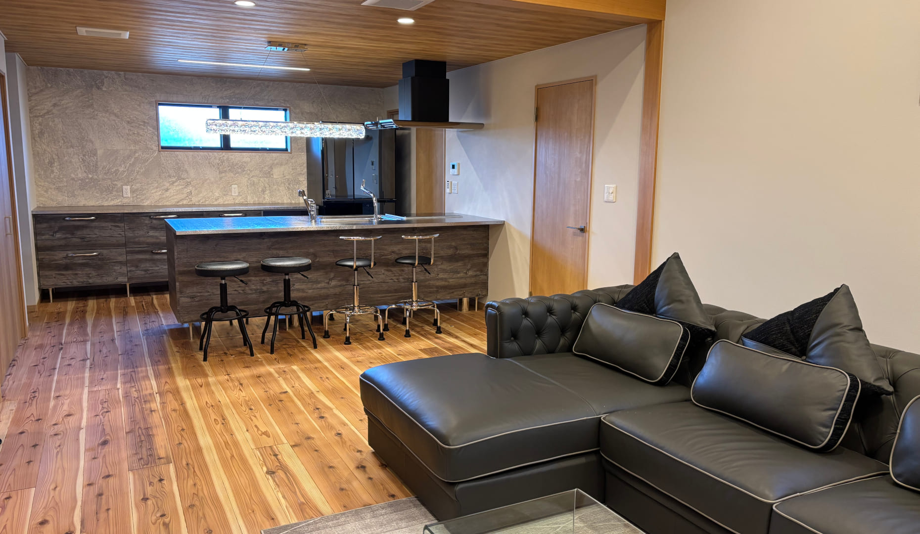 照明の下で食事ができるカウンターは動線も良く、お気に入りのポイントに。ダイニングテーブルを置かないことで、ゆとりのあるリビングが生まれ、大きめのソファでゆったりと過ごせます。