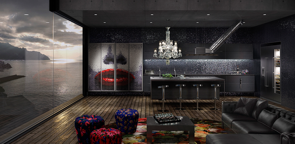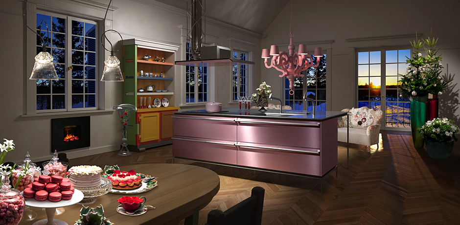 家人欢聚于浓缩了功能的紧凑的厨房里。